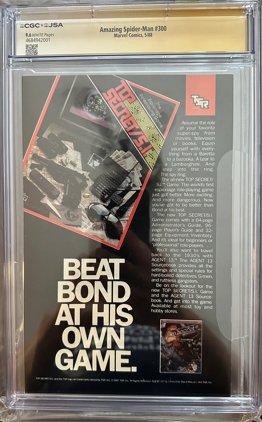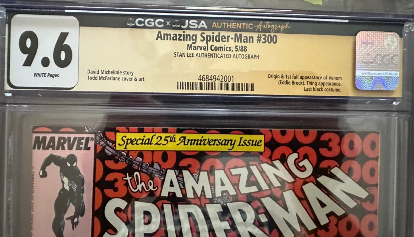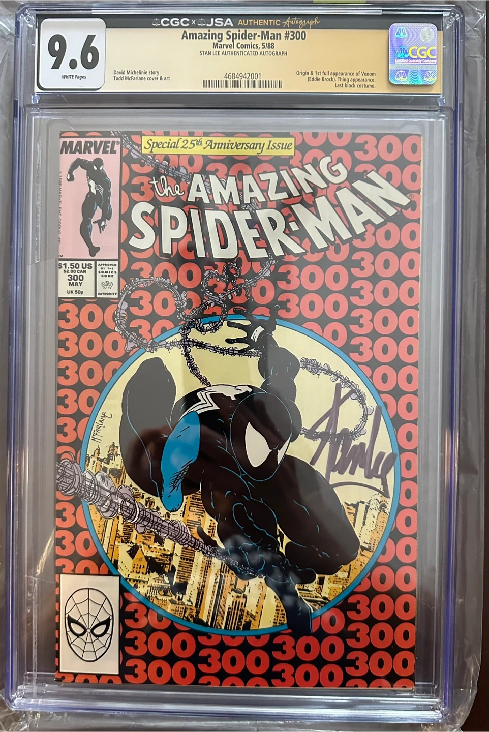 This is The Amazing Spider-Man #300, a Special 25th Anniversary Issue. It features a David Michelinie story and Todd McFarlane cover & art. This copy is graded 9.6 White Pages by CGC and has a Stan Lee authenticated autograph. It also marks the origin & first full appearance of Venom (Eddie Brock). $2500.00 Canadian.