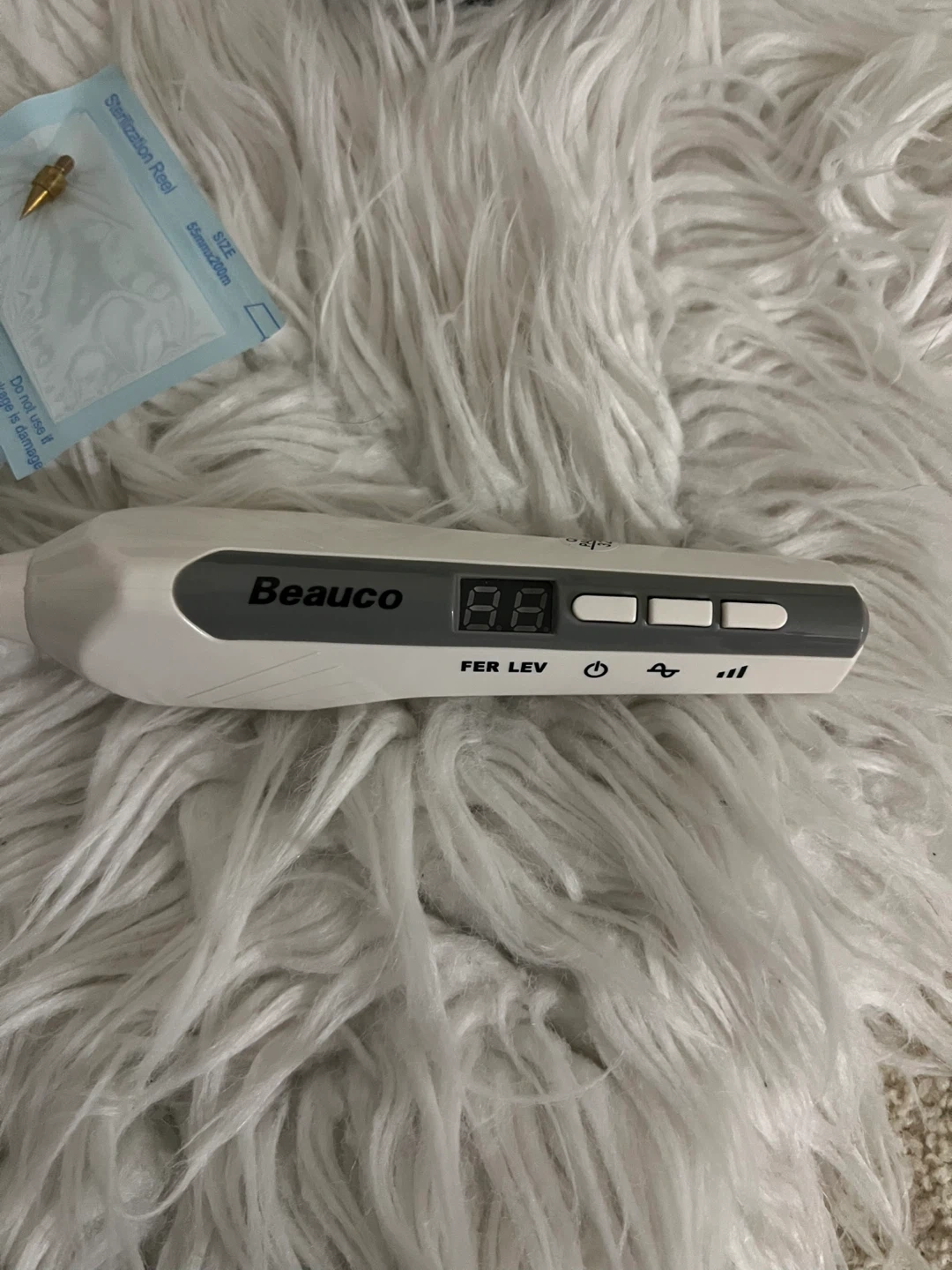 Beauco Fer Lev beauty pen for skin spot removal. It has adjustable power settings and comes with multiple sterile tips and a USB charging cable. A handy tool for home use!