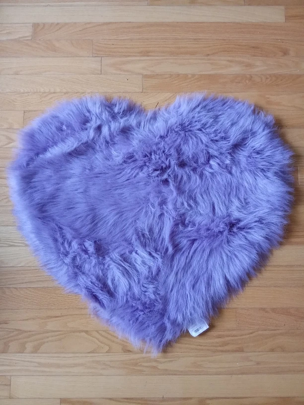 Selling a super cute purple heart-shaped rug made of faux fur! It's in great condition and would be a sweet addition to any room. Perfect for adding a touch of whimsy to your space!