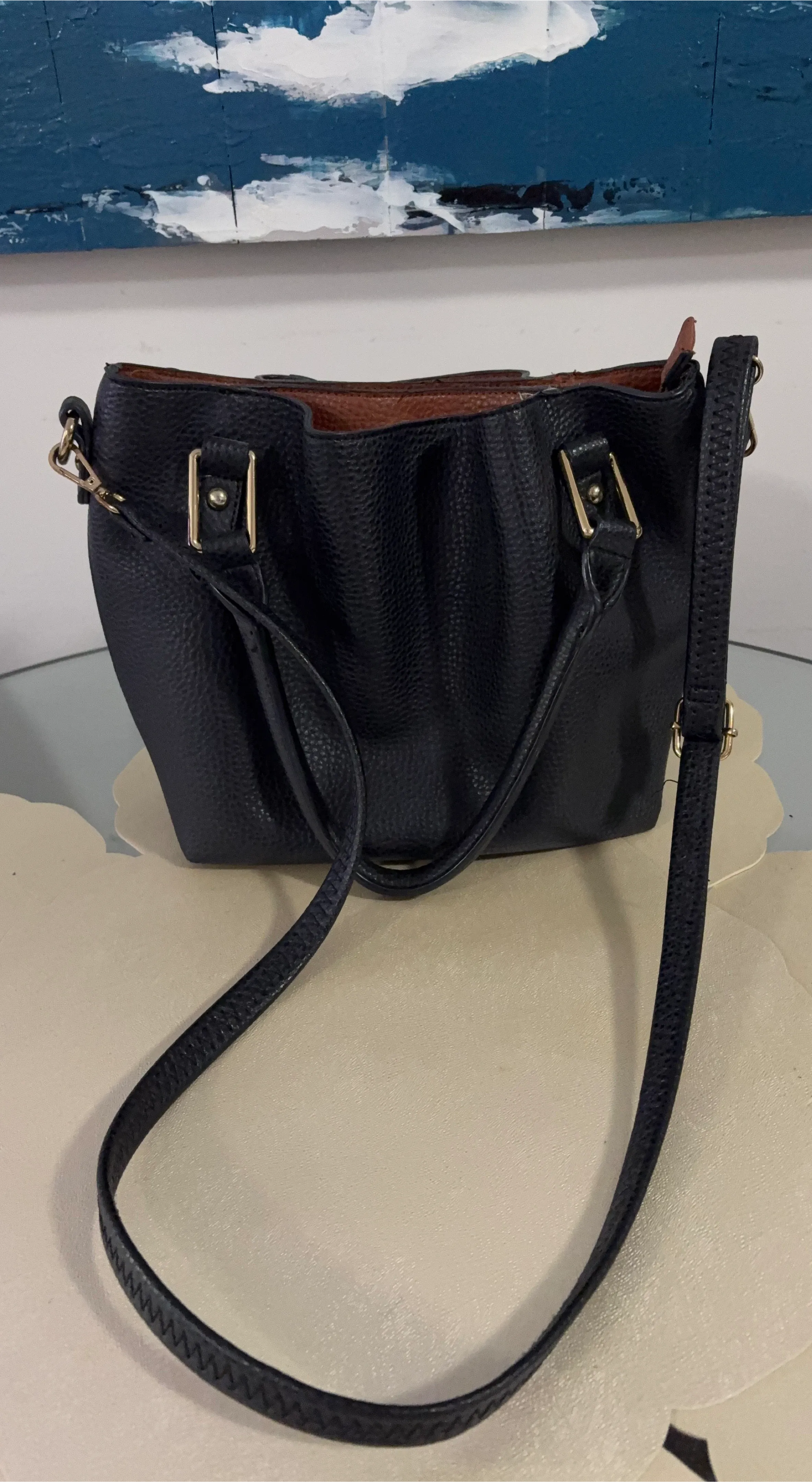 A stylish black shoulder bag, perfect for everyday use! It features a long strap and a shorter handle for versatile carrying options. The interior appears to be a contrasting brown colour.
