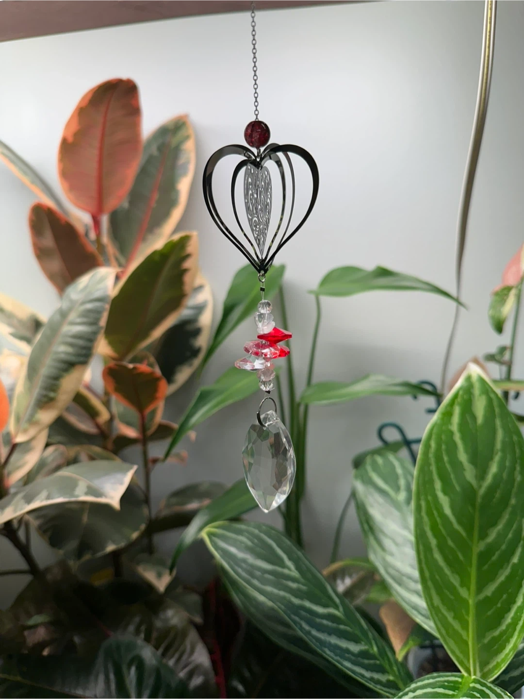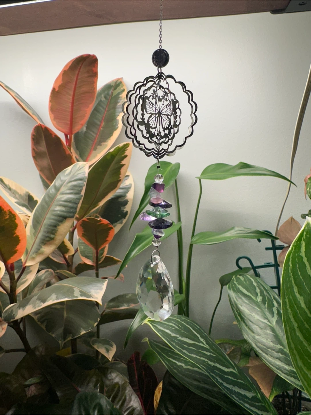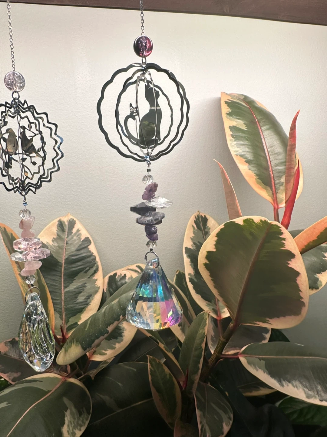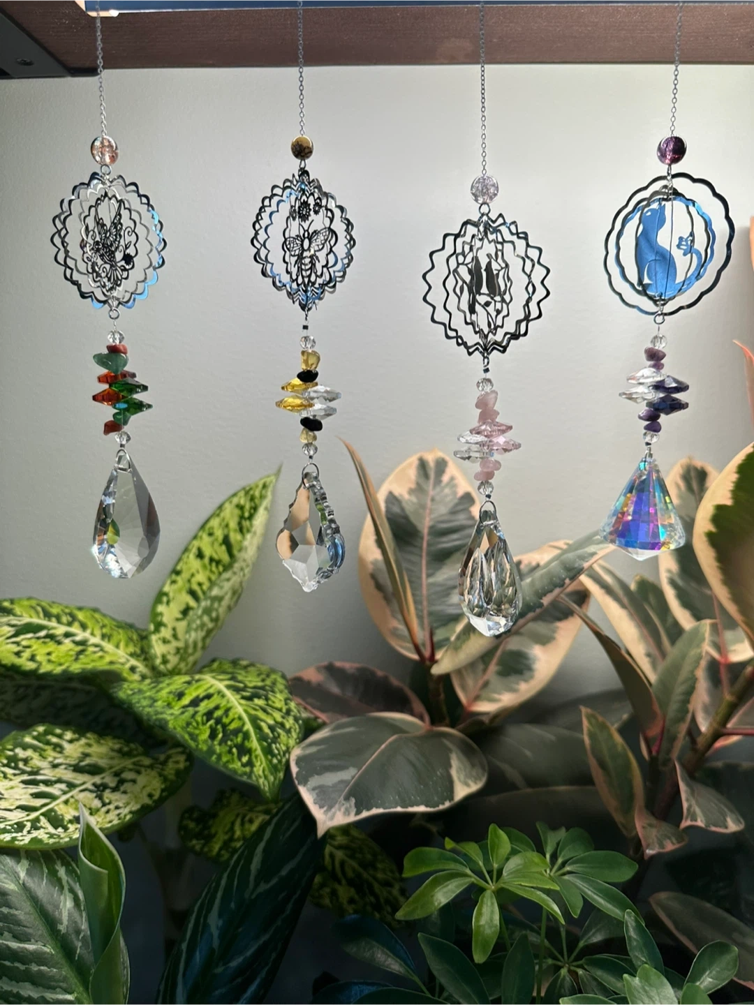 Little decorative Wind Spinner crystal suncatchers. Featuring intricate metal cutouts in different themes like butterflies, Hummingbirds, Hearts and Cats along with faceted glass prisms and colourful beads. They hang and sparkle beautifully!