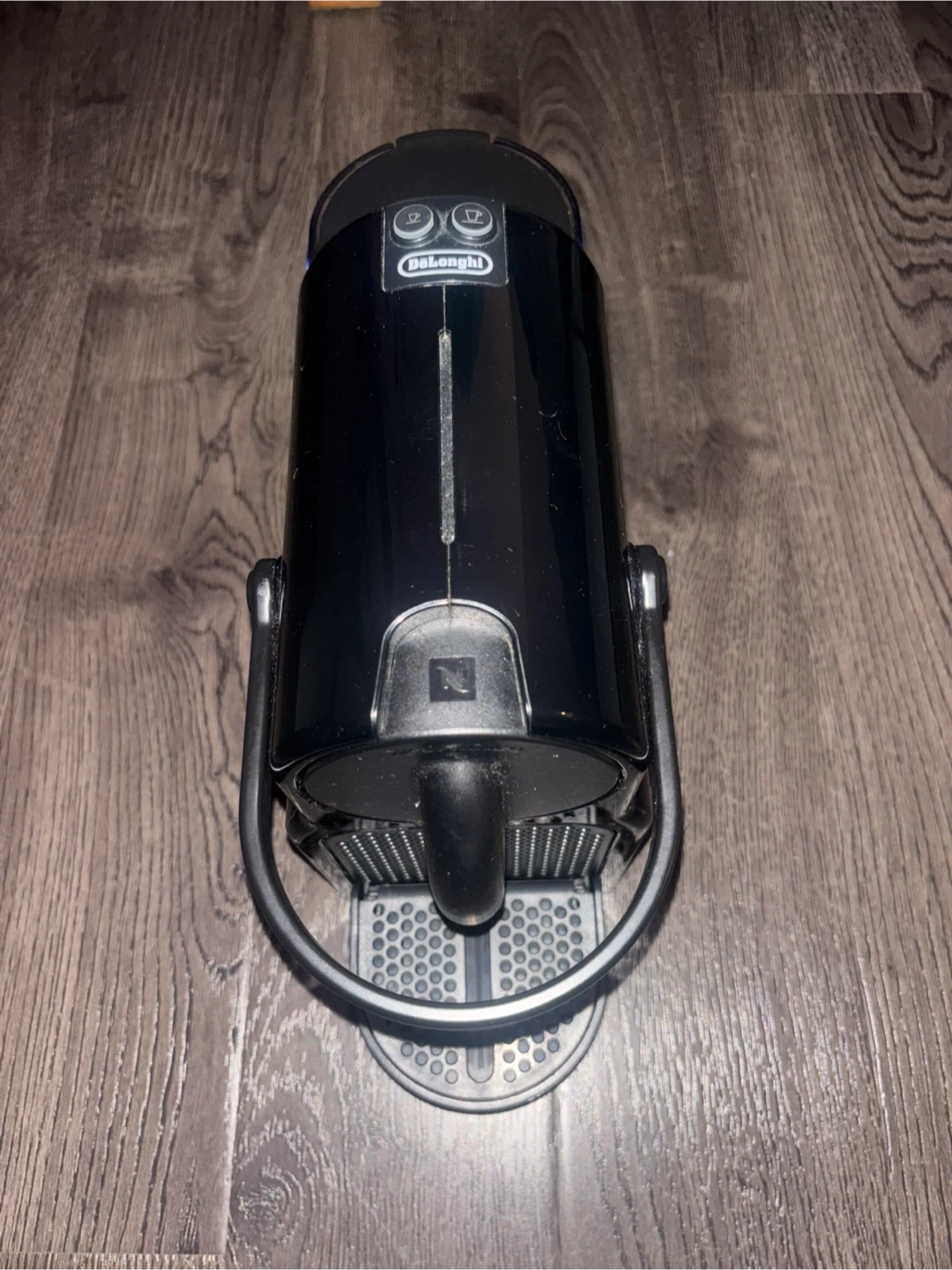 This is a DeLonghi Nespresso coffee machine. It's black and sleek for your kitchen counter. It makes quick espresso shots. In very good condition!