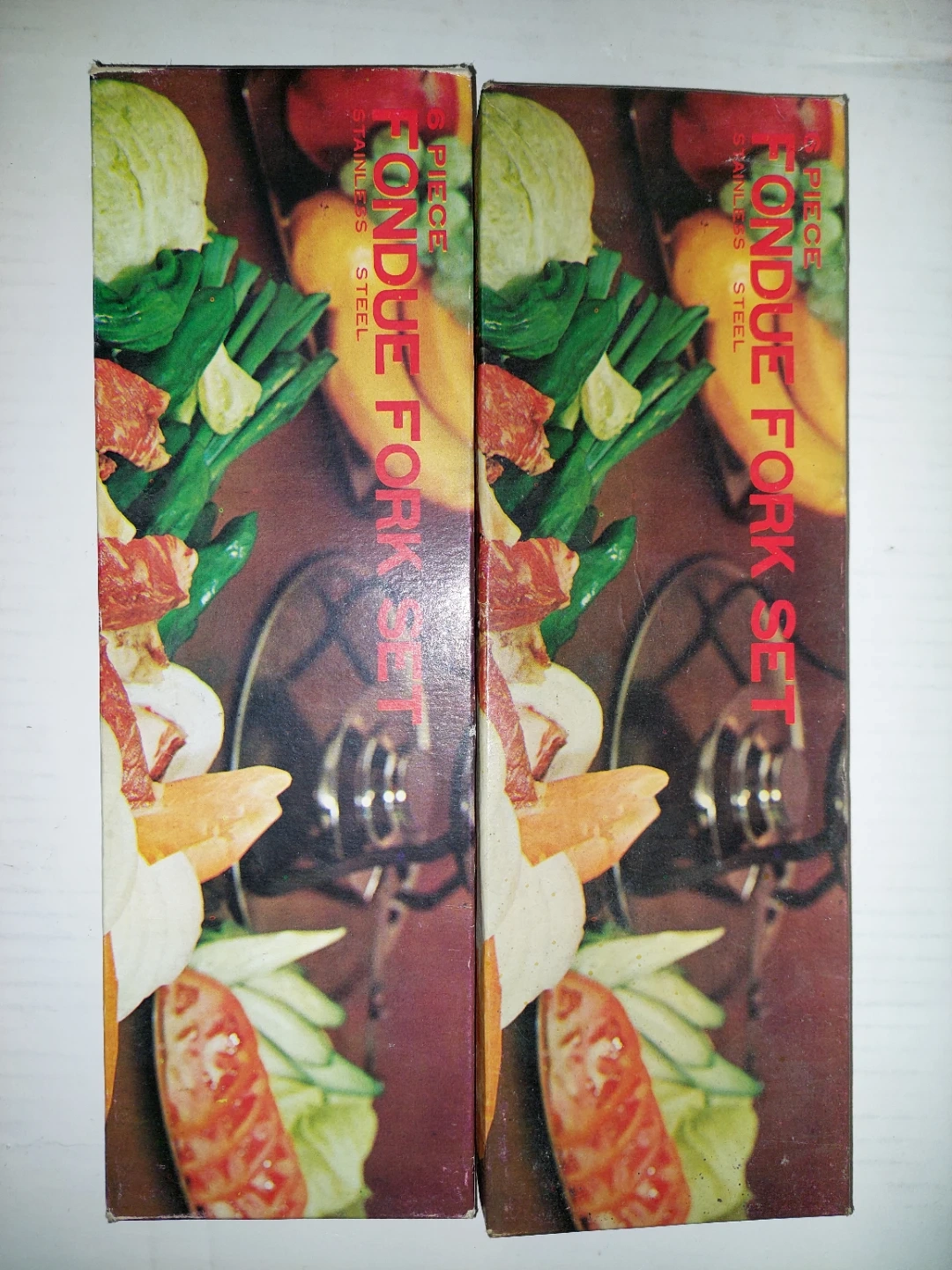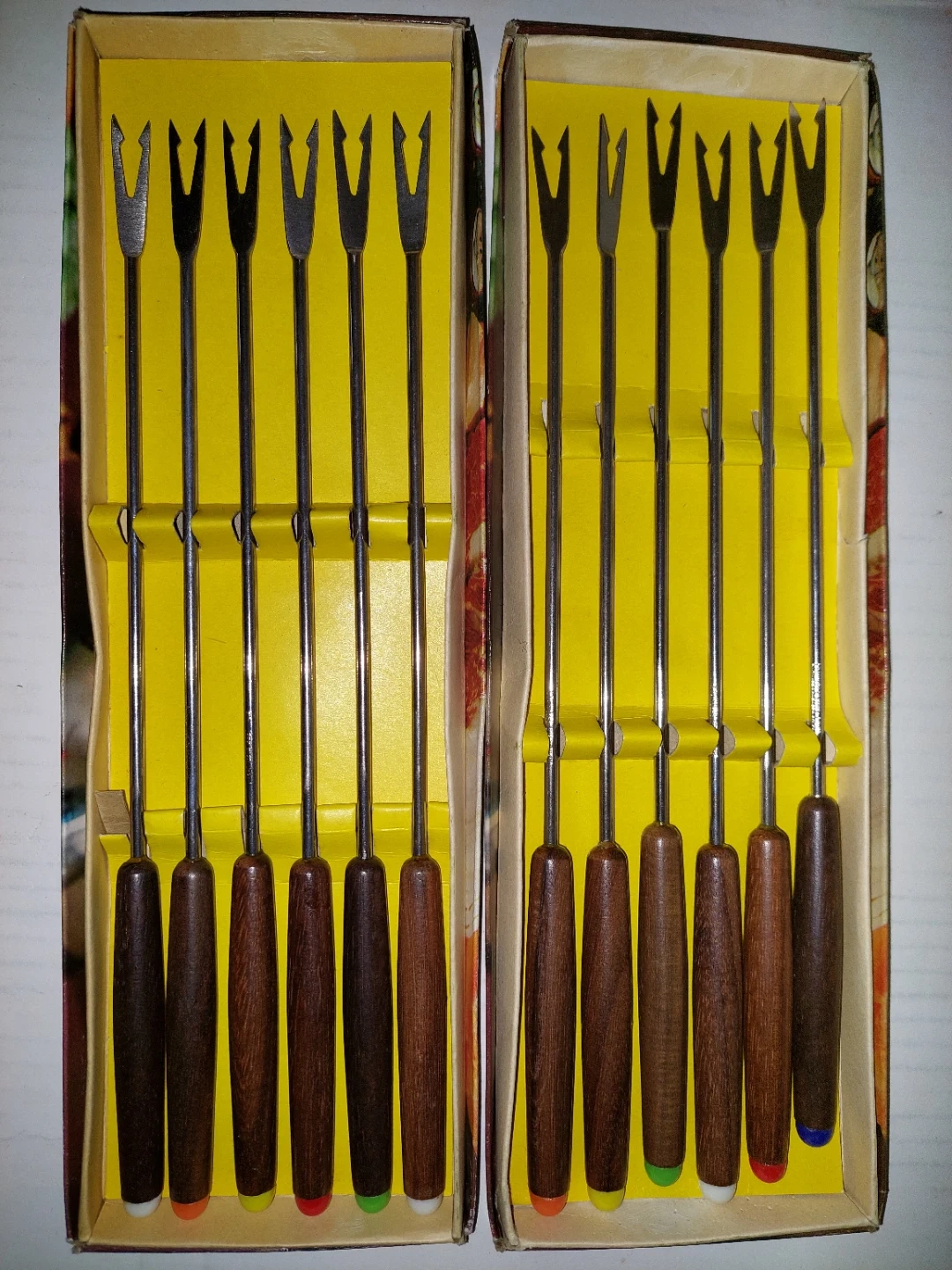 Two sets of retro fondue forks. 6 firks per set.. Each fork has a stainless steel tip and a wooden handle. Coloured-coded tips on handles to keep track of each fork.