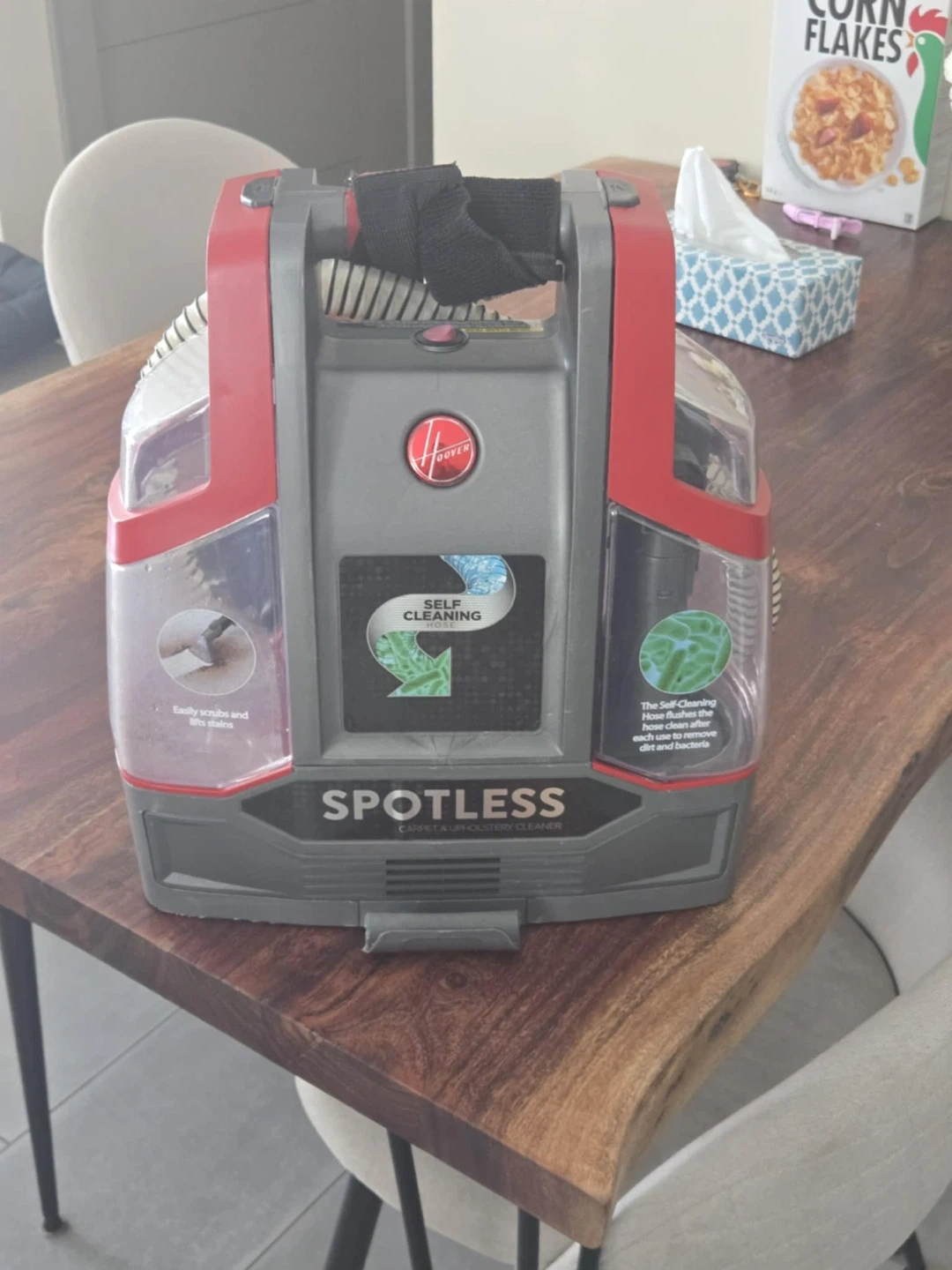 This Hoover Spotless carpet and upholstery cleaner makes tidying up simple. It easily scrubs and lifts stains. The self-cleaning hose flushes the hose clean after each use to remove dirt and bacteria.