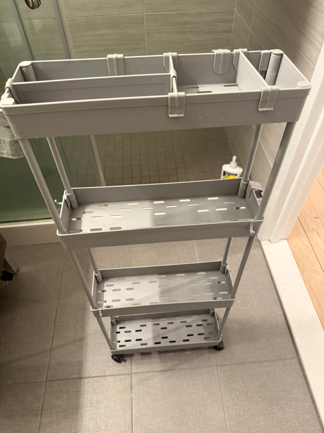 This slim rolling cart is perfect for maximizing storage in tight spaces. It features three tiers with compartments for organizing toiletries, cosmetics, or other bathroom essentials. Its narrow design makes it ideal for fitting next to sinks or toilets.