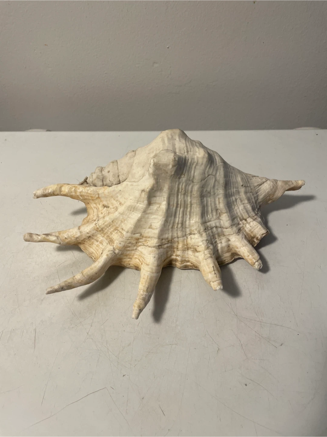 This is a large, natural seashell with prominent spikes. Its colour is off-white with some tan striations. It's a unique decorative piece that could add a touch of the ocean to any room.