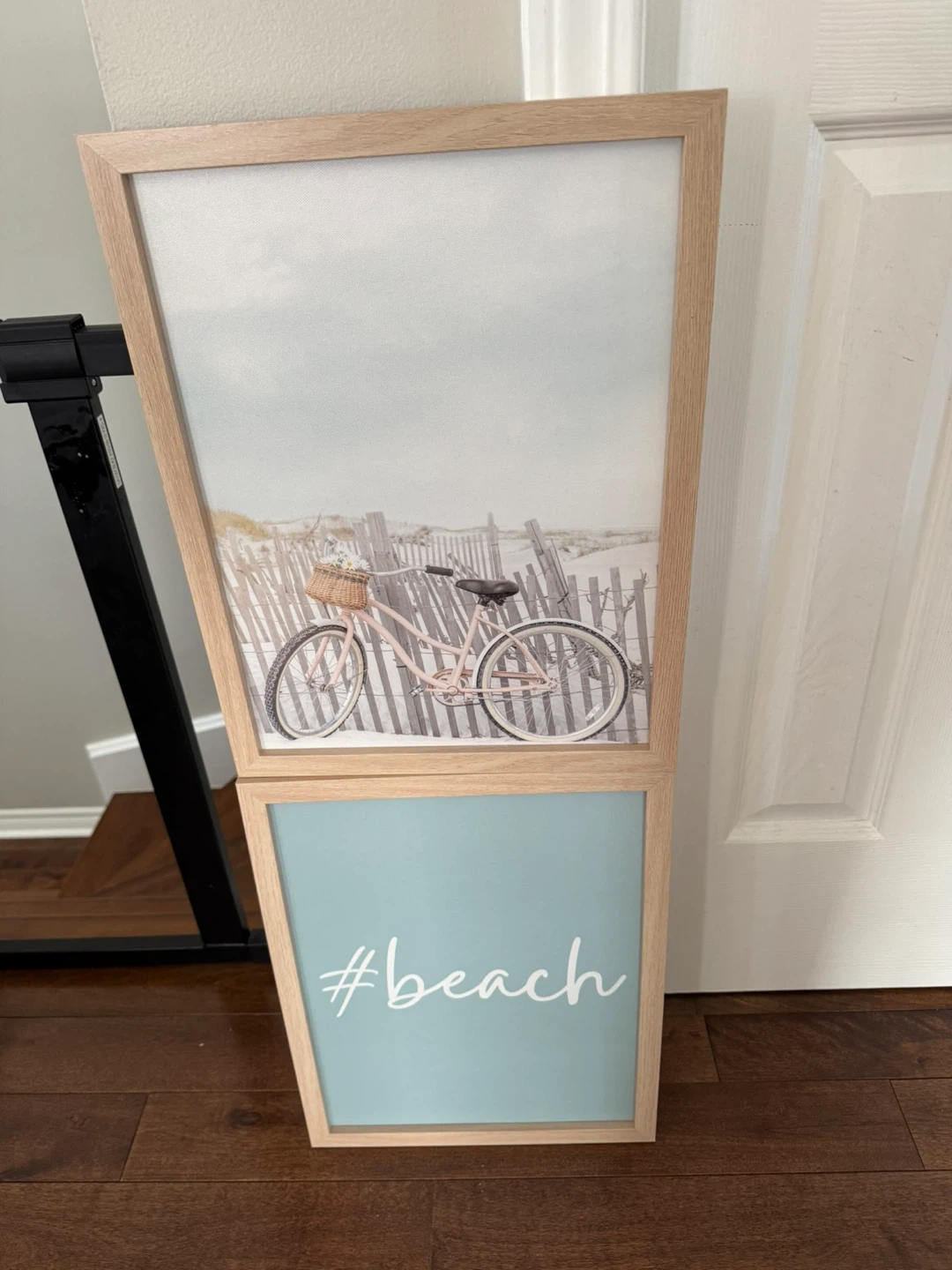 Set of two framed wall art prints. One features a bicycle leaning against a beach fence, and the other has "#beach" text on a light blue background. Natural wood frames. Measurements are approximately 13 inches wide by 17 inches tall each.