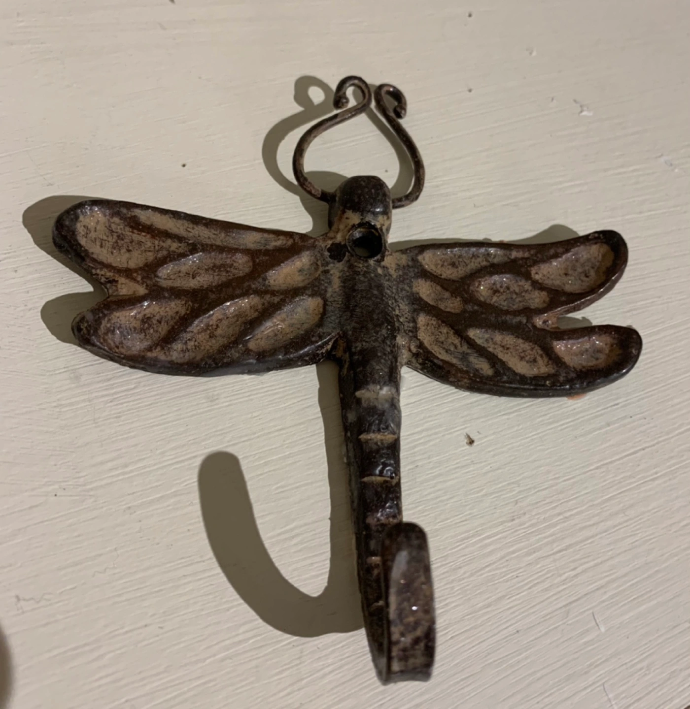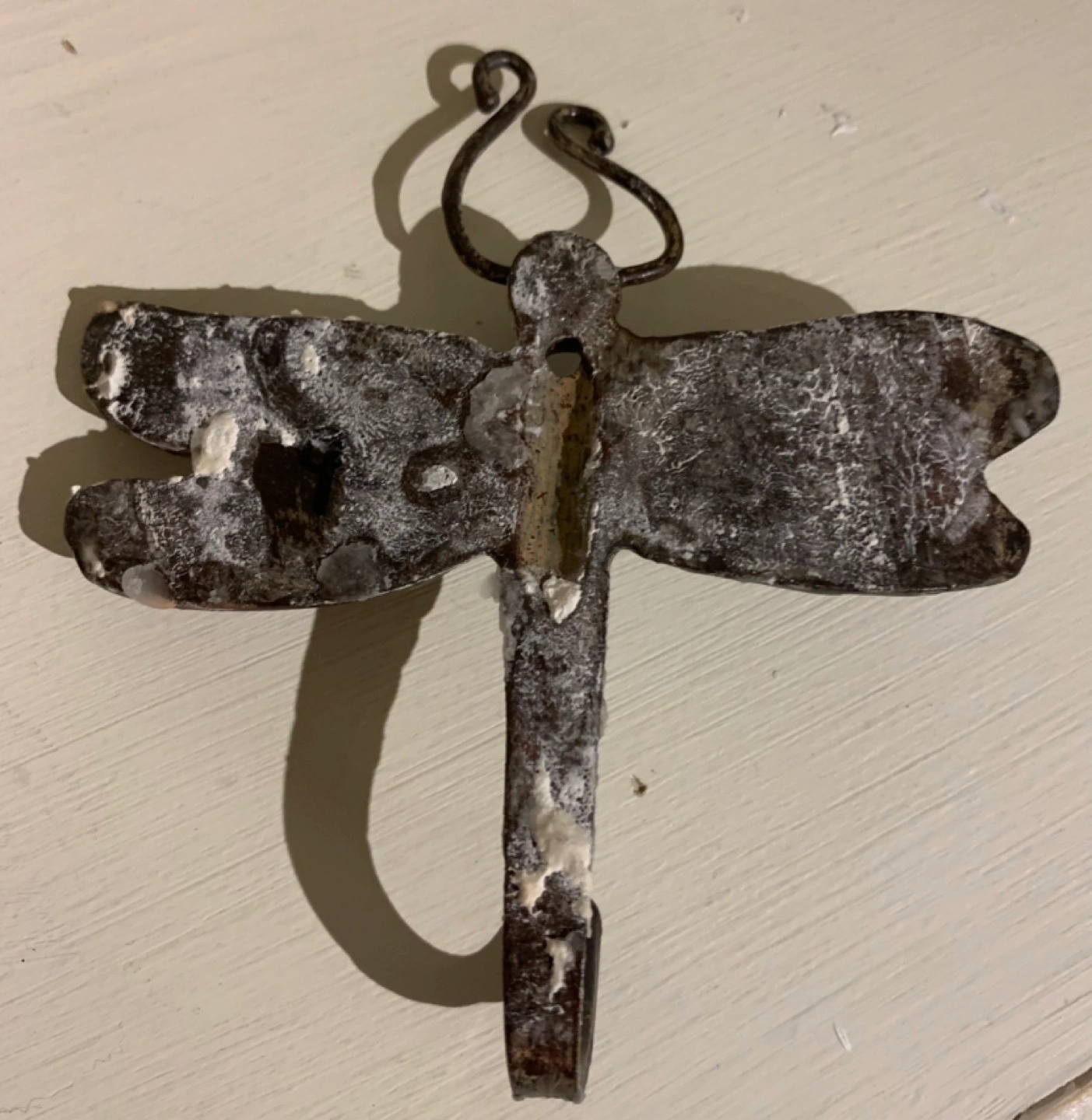 Metal dragonfly hook. Great for a rustic or farmhouse decor theme. It has a hole in the top to hang it. 4” x 4”
