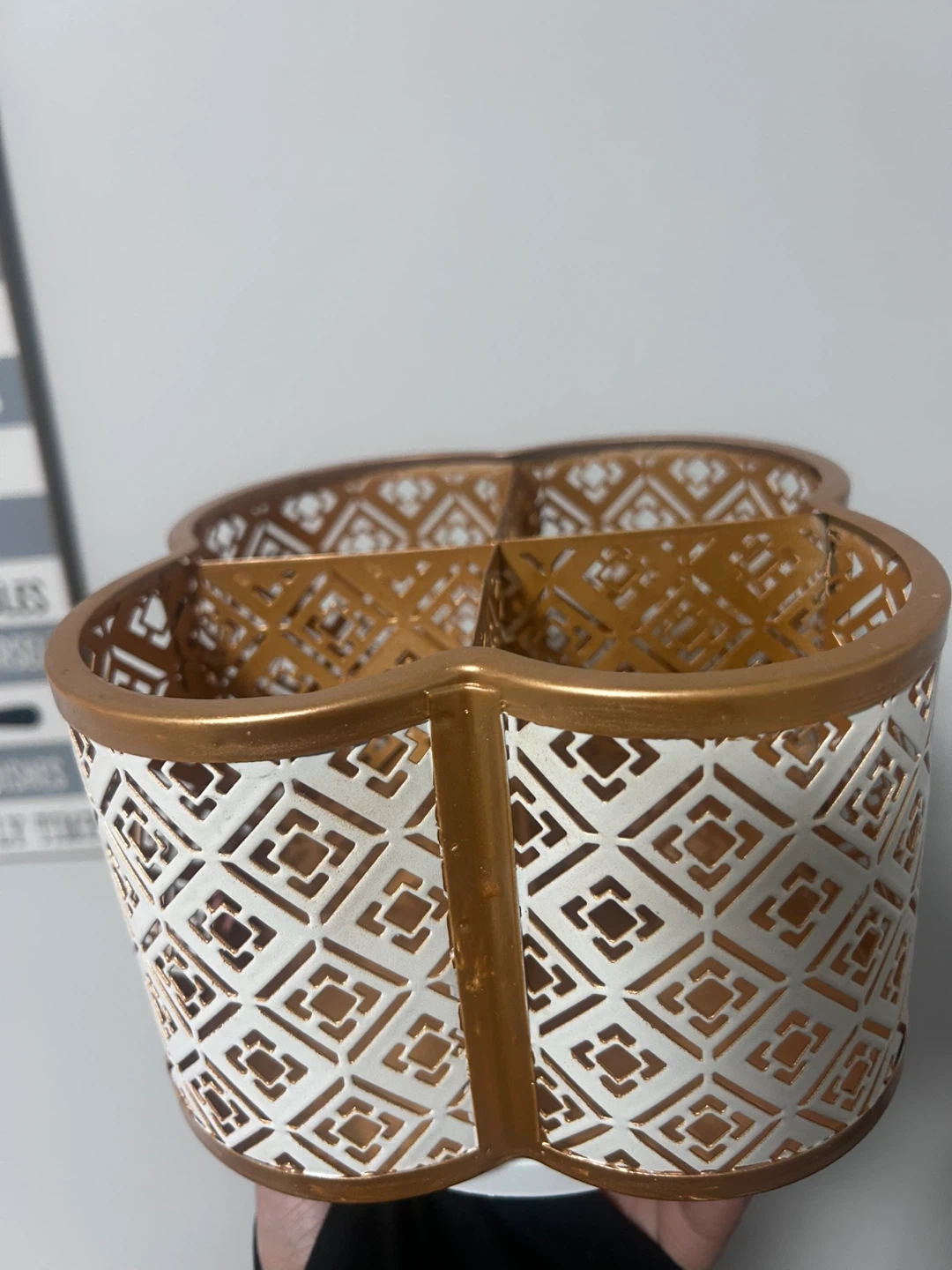 This decorative metal basket has four compartments. It's great for organizing small items like mail, keys, or craft supplies. The gold finish with intricate cut-out patterns adds a touch of elegance to any space.