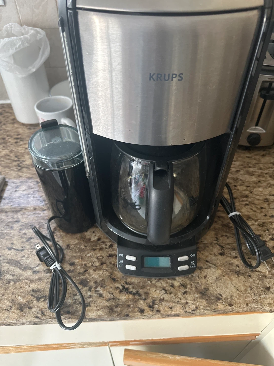 This is a Krups coffee maker. It has a programmable timer and a carafe. This appliance is great for making morning coffee.