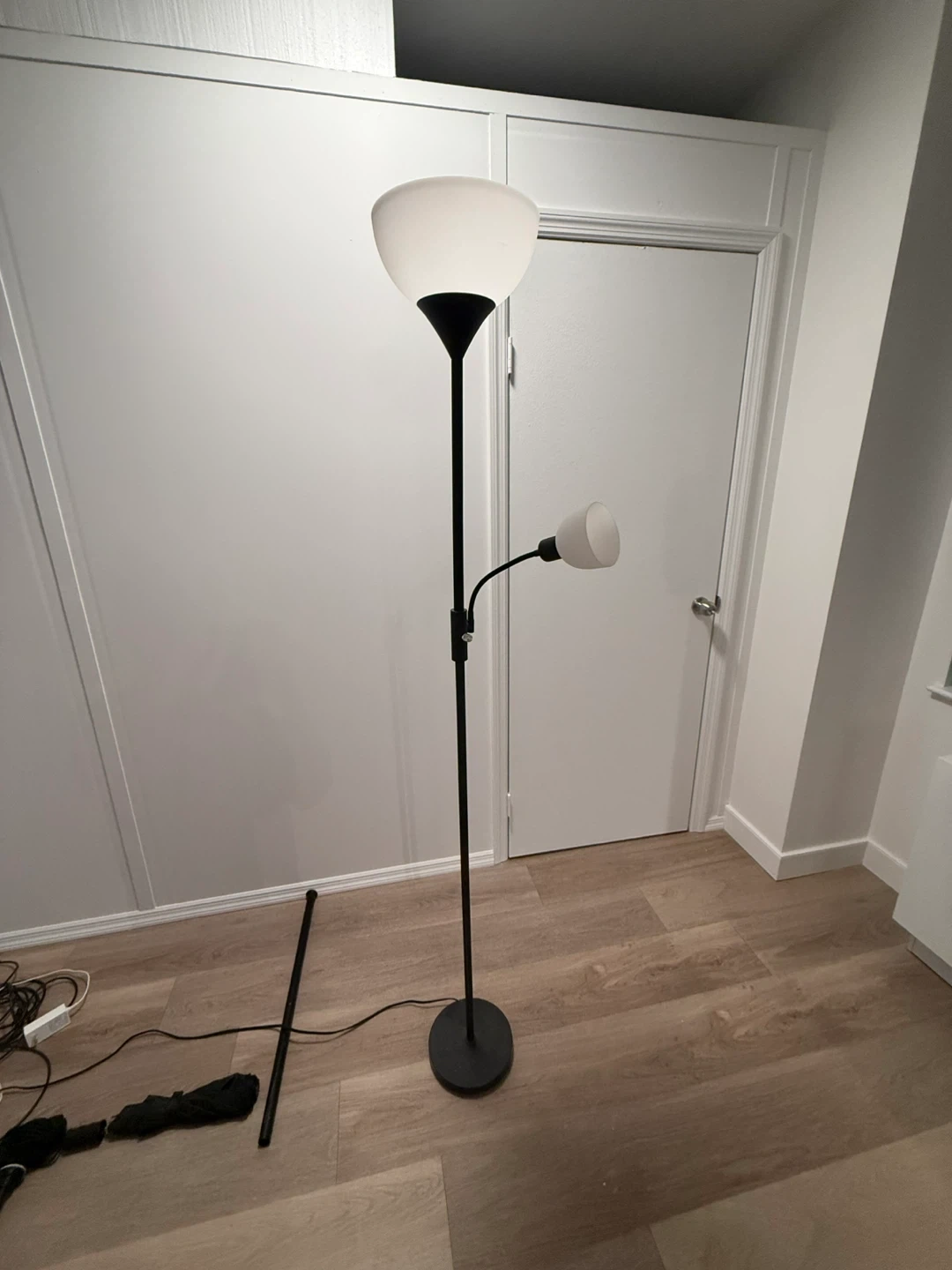 This black floor lamp features a main light and an adjustable reading light. It has a sturdy round base and a black metal pole. It's perfect for adding light to a living room or bedroom!