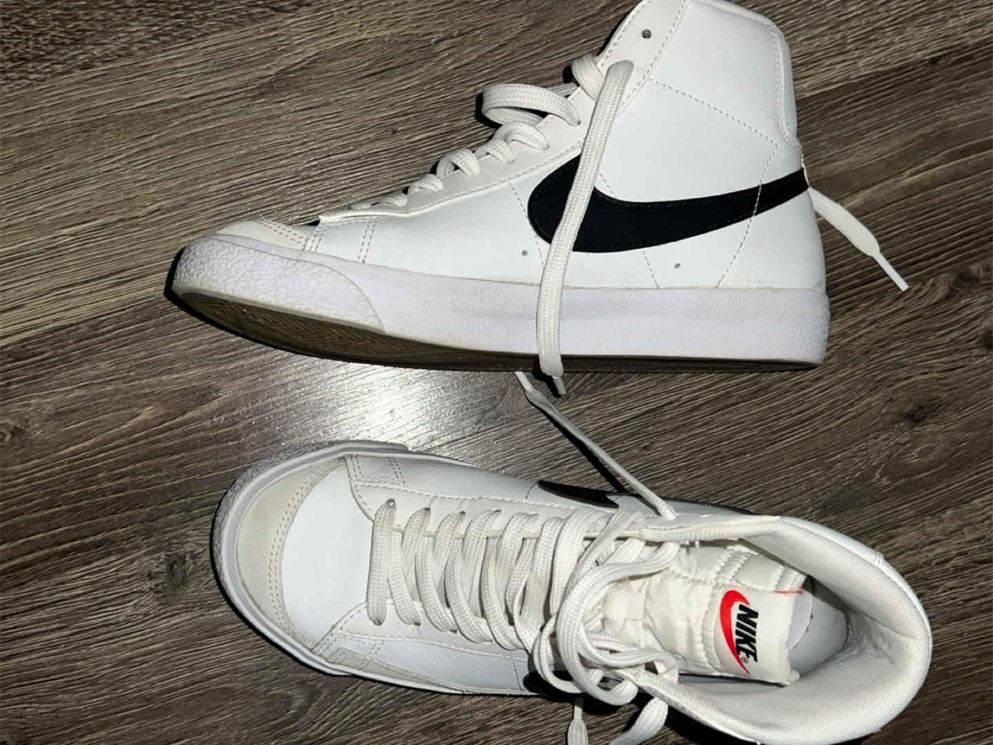 White and black high top Nike Blazer Mid '77 sneakers. They feature a classic design with a durable leather upper. Great for everyday wear!