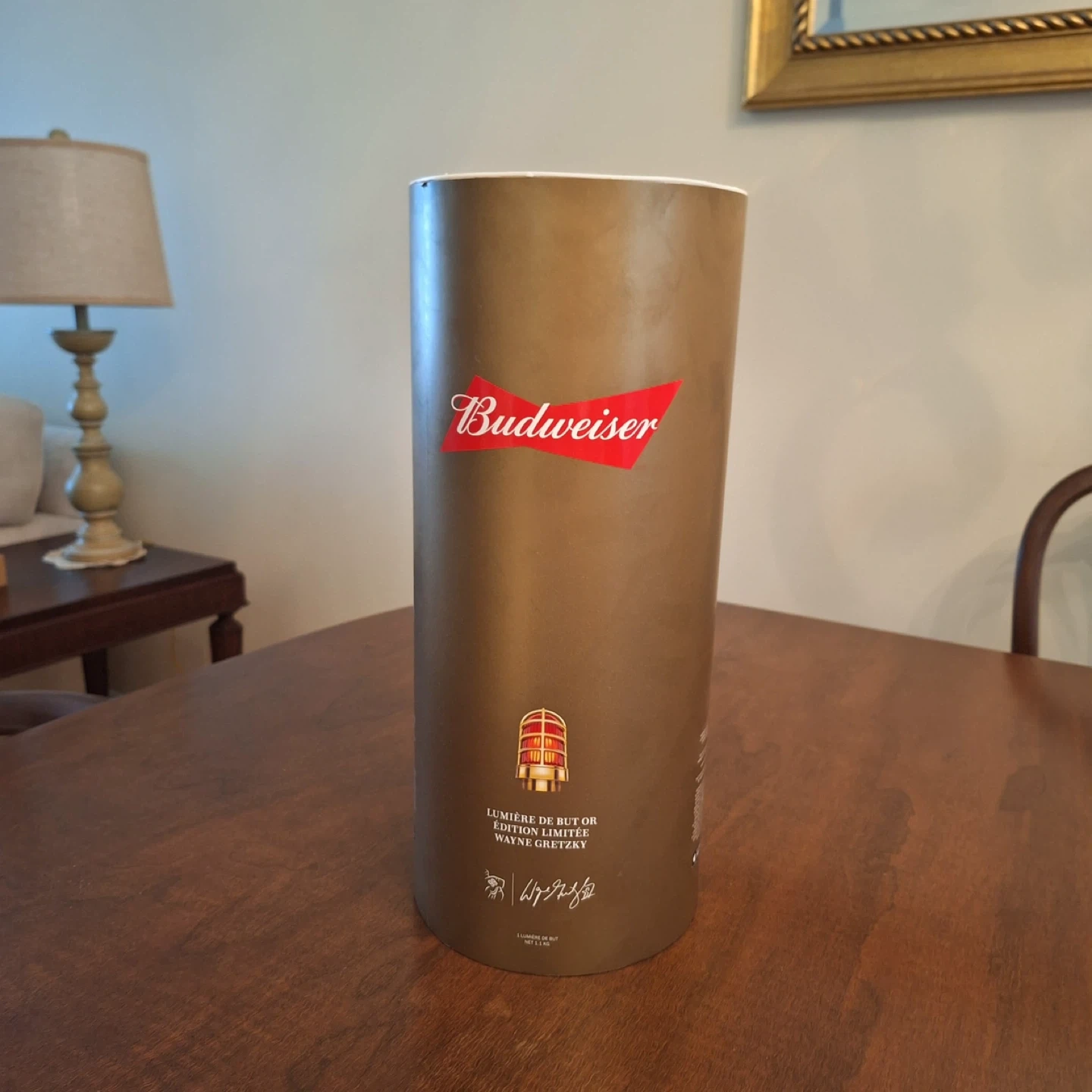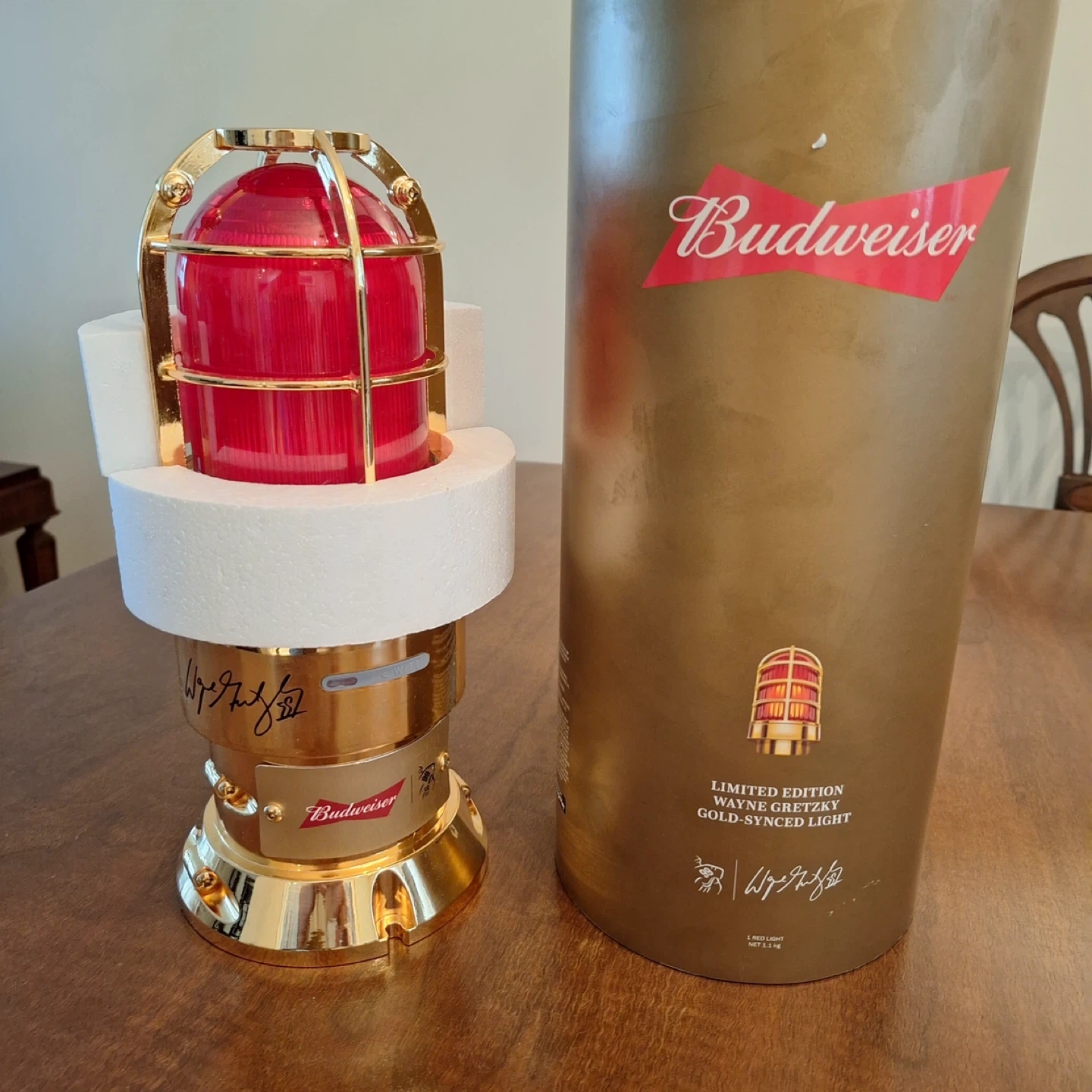 Budweiser Limited Edition Wayne Gretzky Gold-Synced Light. It's a red light with gold accents. Comes with original packaging. Can be synced to your phone to light up when your team scores. Never used in original packaging. Certification of authenticity included. Limited edition 2055 of 2180
