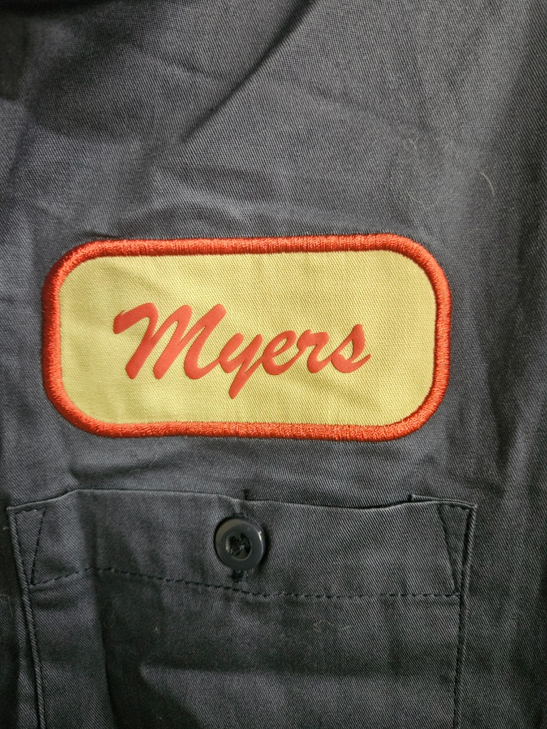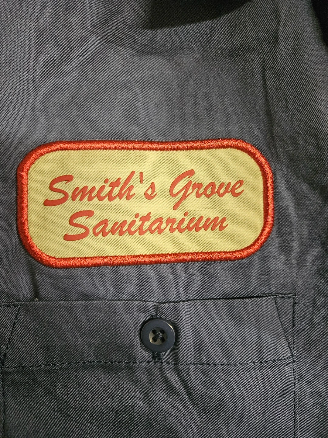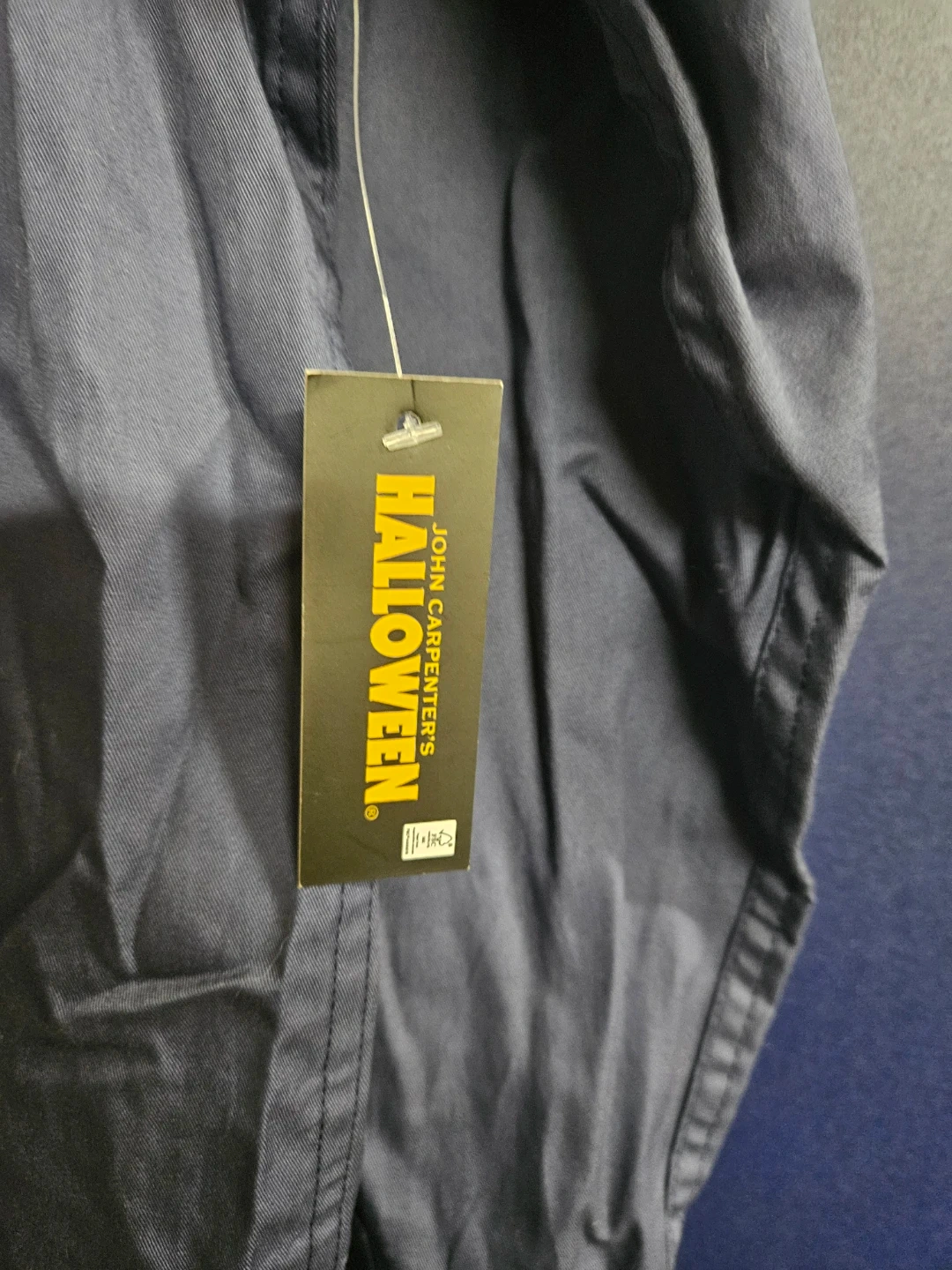 This is a John Carpenter's Halloween costume shirt. It features a "Myers" patch on the right chest and a "Smith's Grove Sanitarium" patch on the left chest. The shirt is made of 100% cotton. Size is M/M.