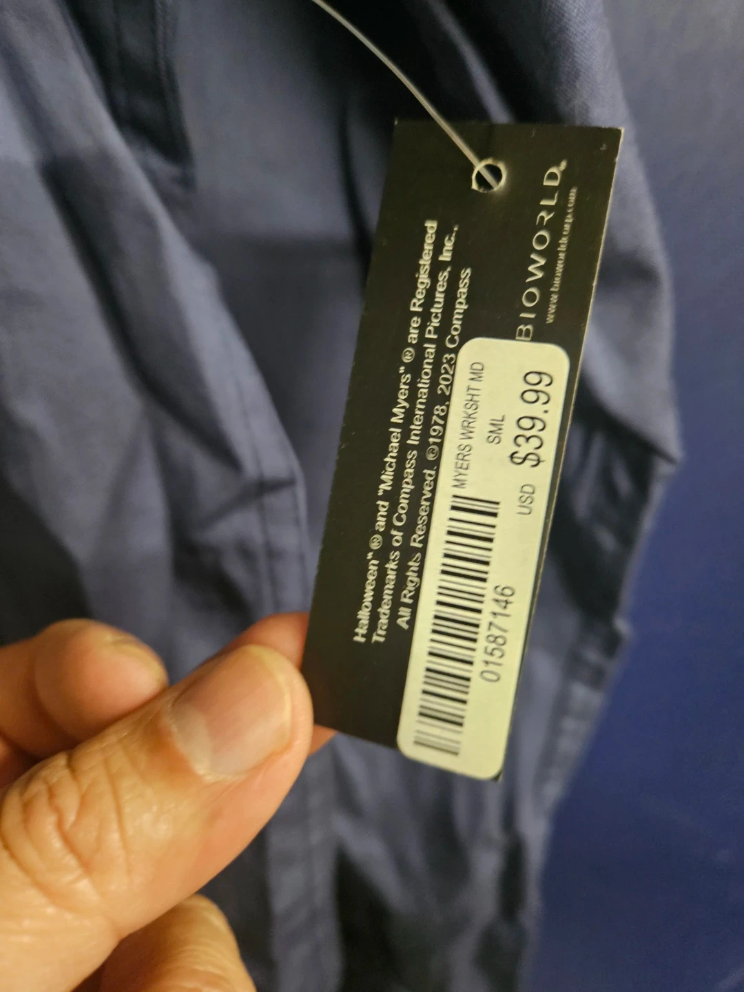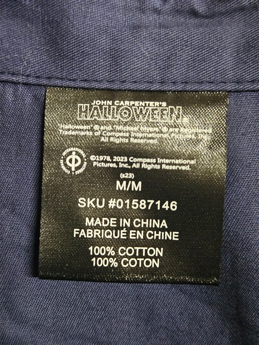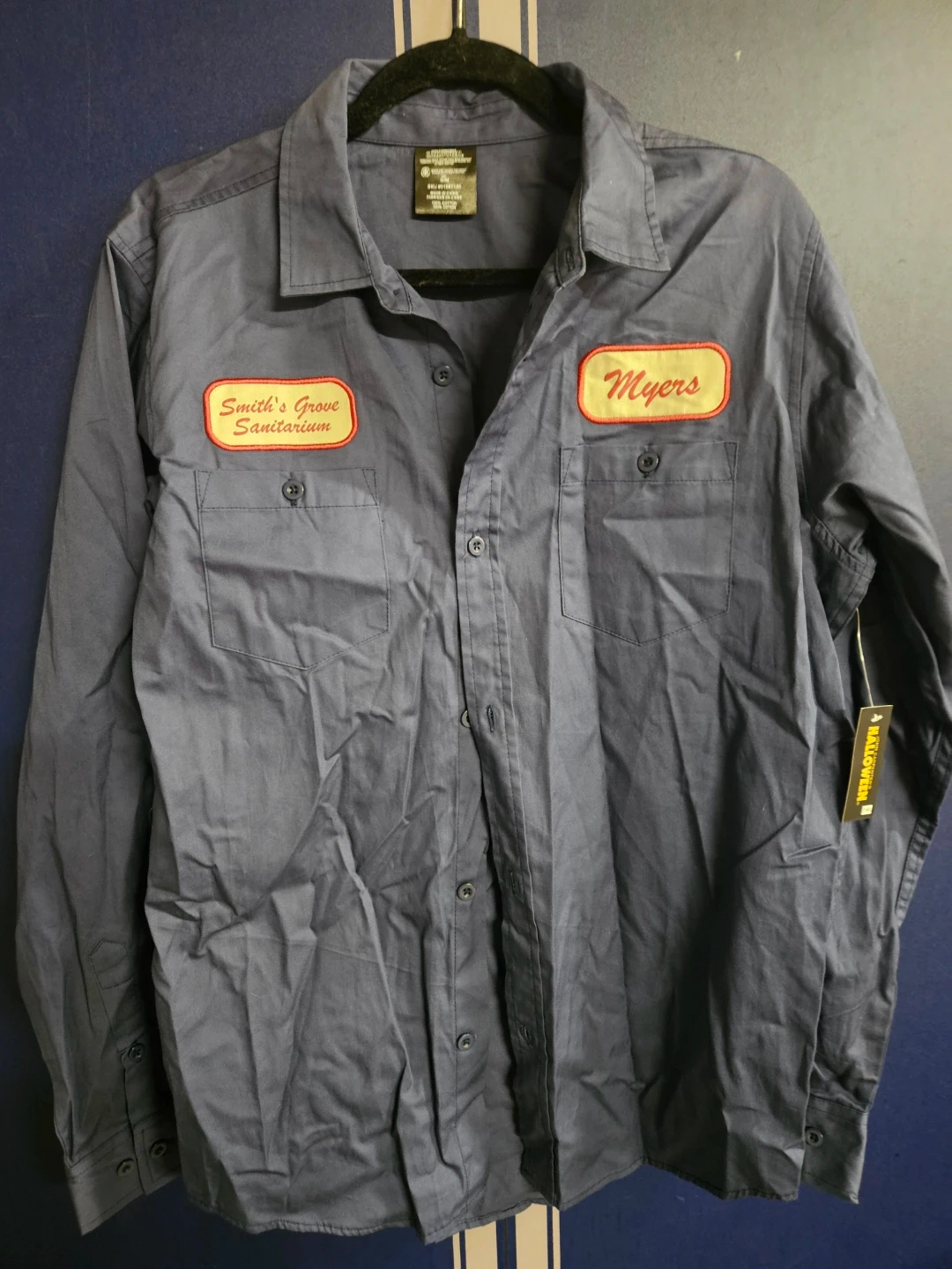 This is a John Carpenter's Halloween costume shirt. It features a "Myers" patch on the right chest and a "Smith's Grove Sanitarium" patch on the left chest. The shirt is made of 100% cotton. Size is M/M.