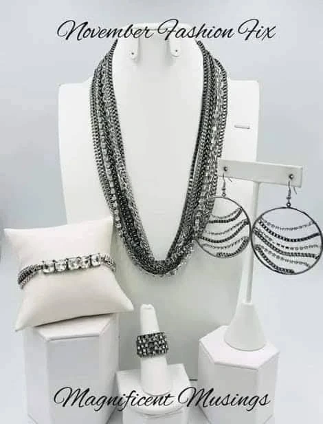This is a beautiful Paparazzi necklace set that includes a necklace, earrings, bracelet, and ring. It's perfect for adding a touch of elegance to any outfit!