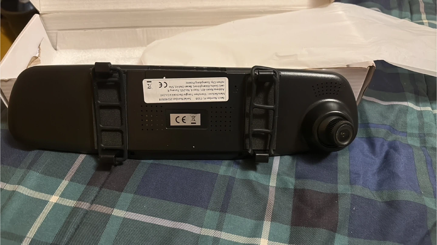 This is a rearview mirror dash cam with a backup camera. It's in a box and includes all necessary cables. The mirror has a blue tint and buttons along the top edge.