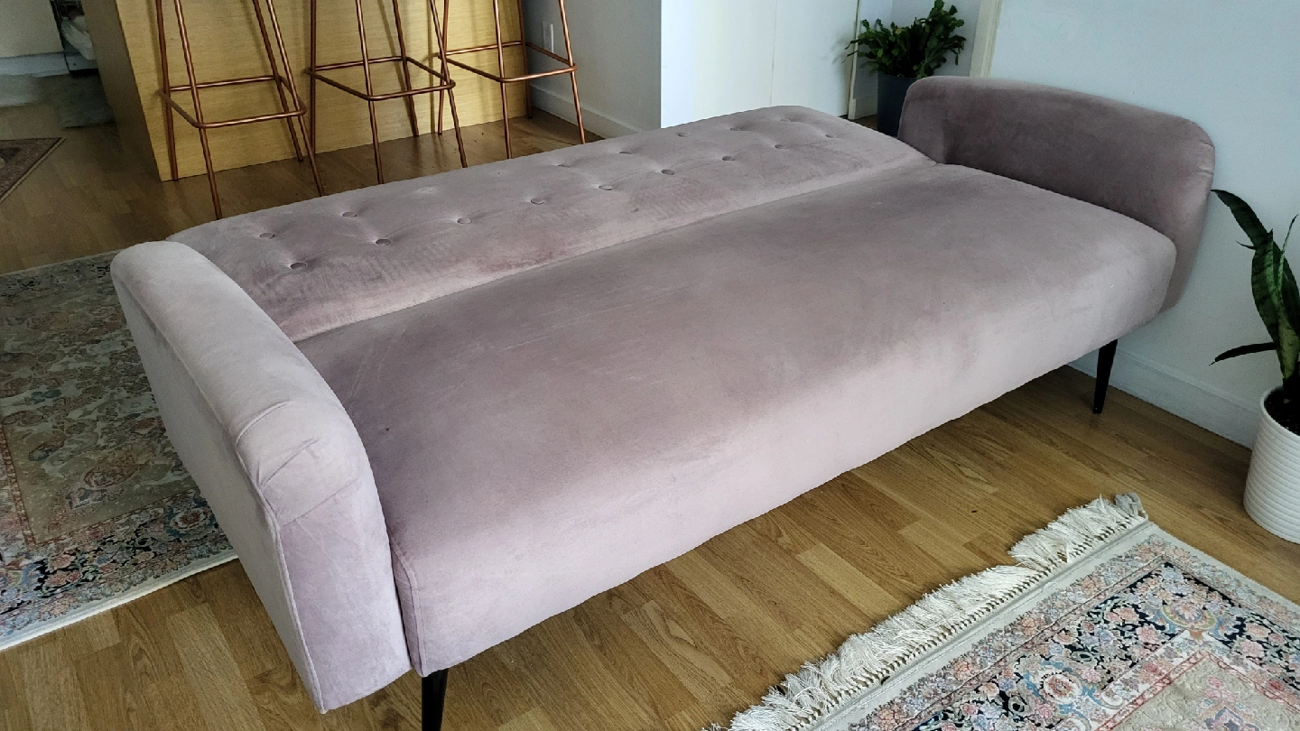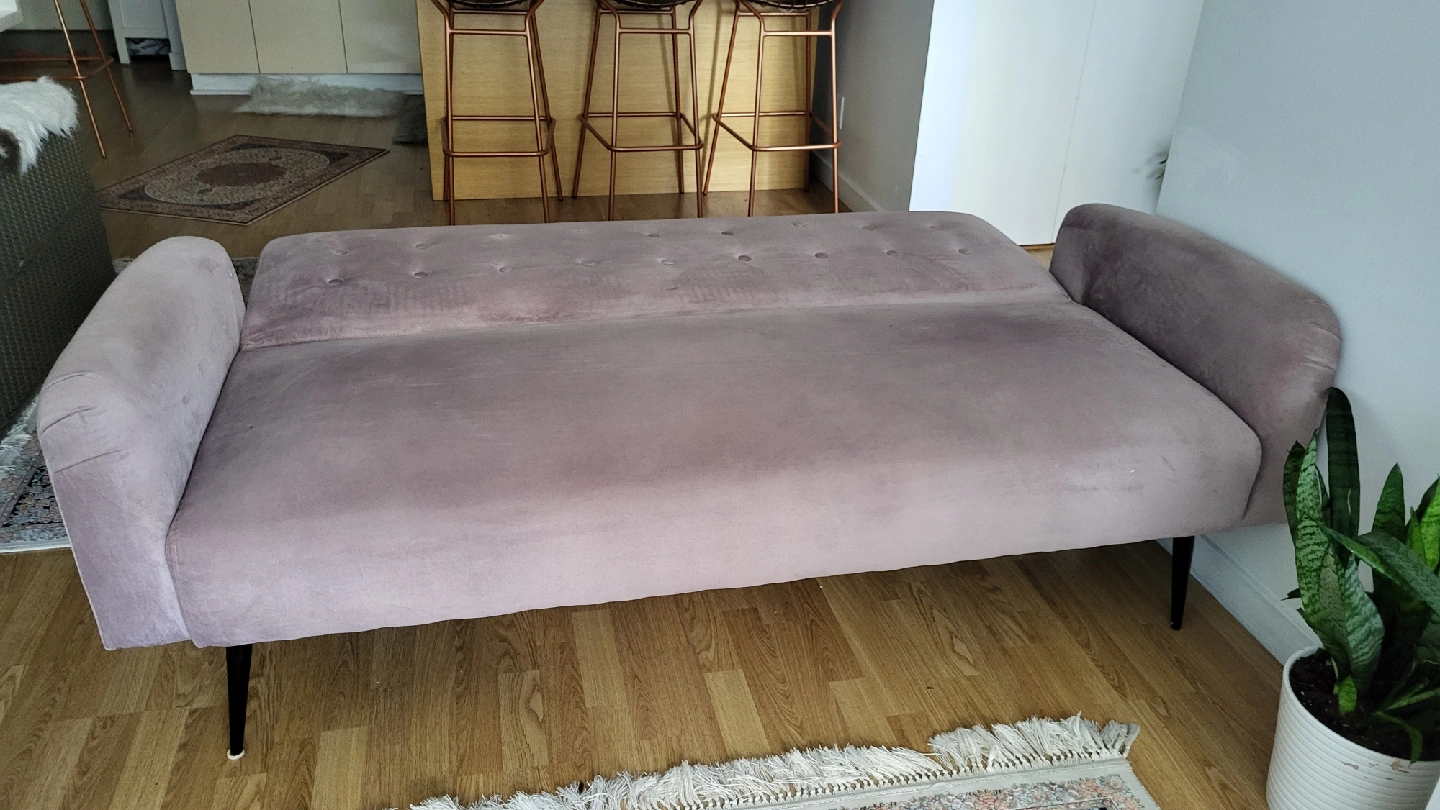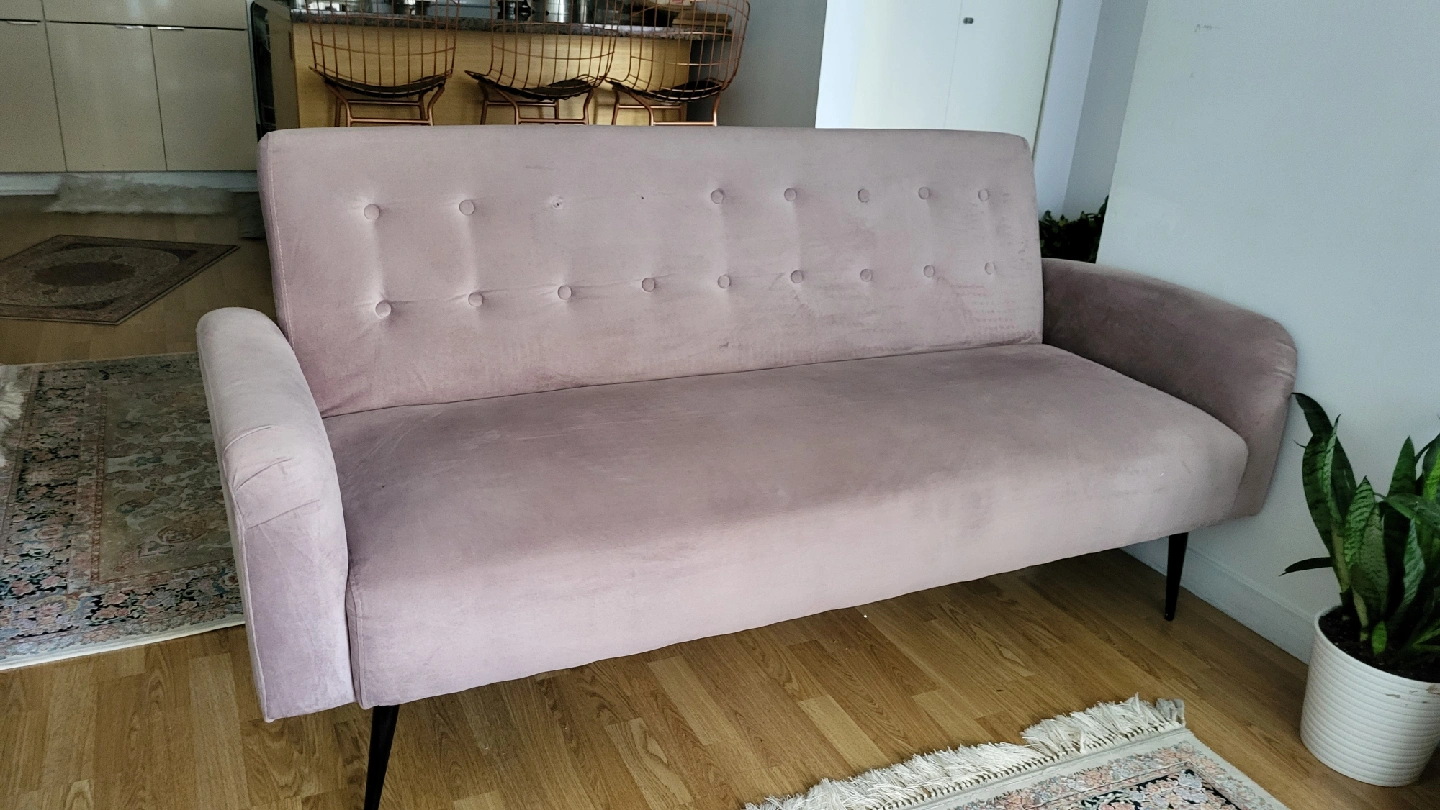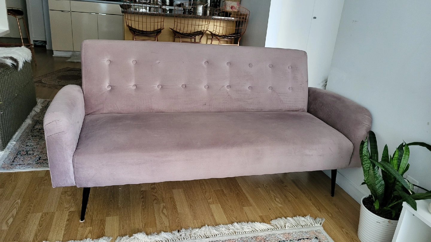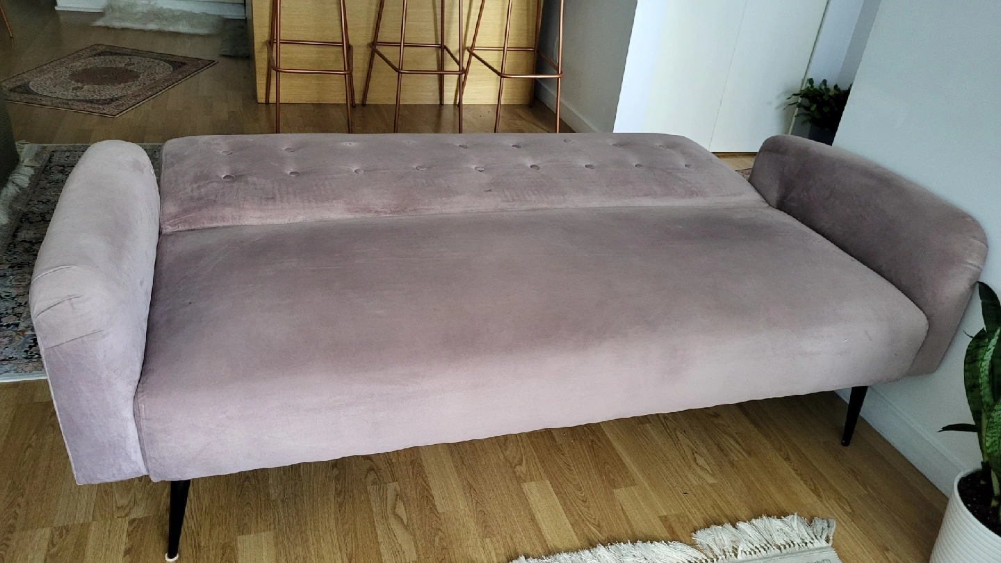 Selling a lovely pink velvet sofa bed! It's in great shape and would be a stylish addition to any living room or spare room. Perfect for lounging or accommodating guests