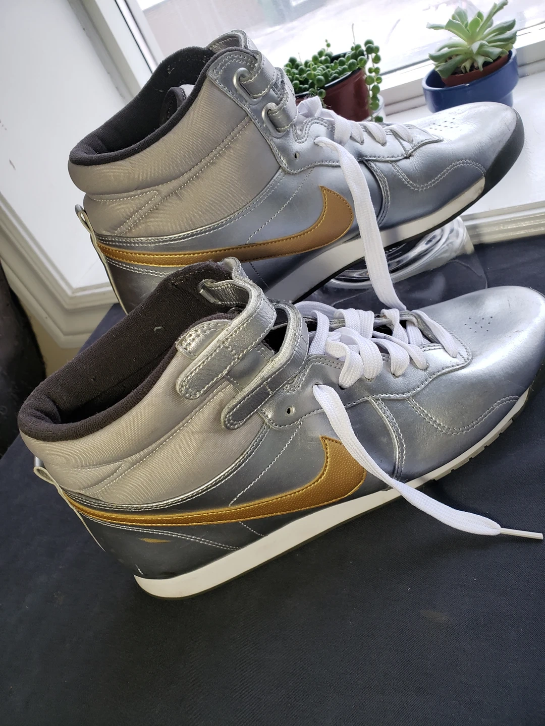 Nike High tops, size states 9.5 (no specification to M or W) measuring 11" long. Very comfortable but too big for me as a 9W... Worn with a couple small scuffs though well taken care of and cleaned. I would use these as a good back up winter boot for mild Toronto snowfalls!