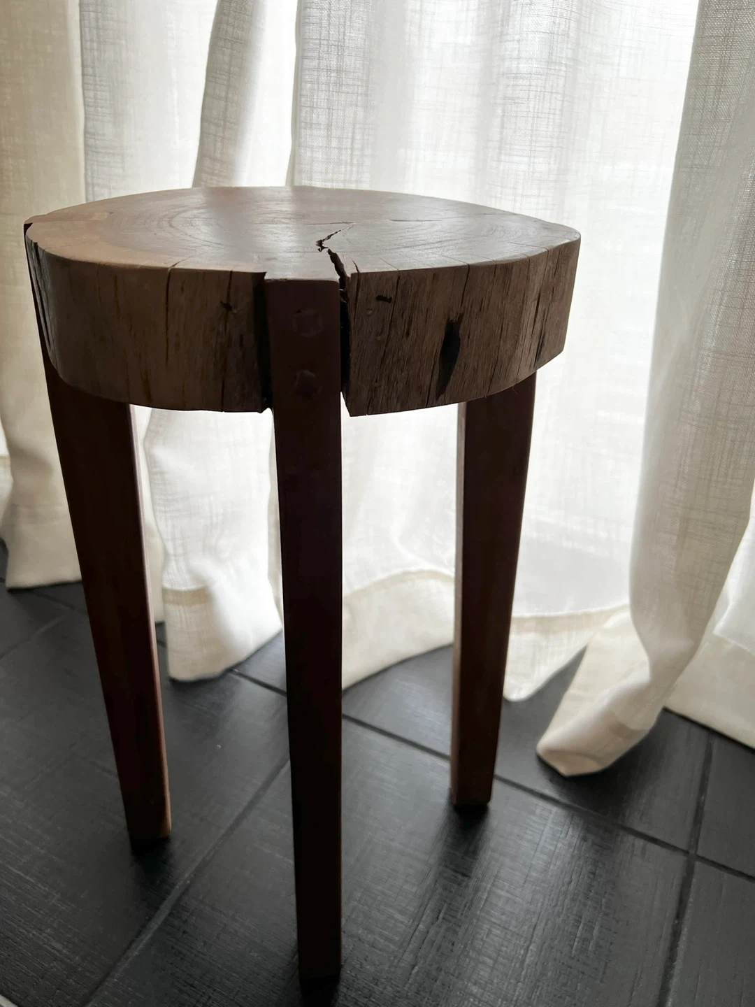 A charming accent table featuring a thick wood slice top with visible grain and natural cracks. It's supported by three sturdy, dark-toned legs. This piece adds a touch of rustic elegance to any room.