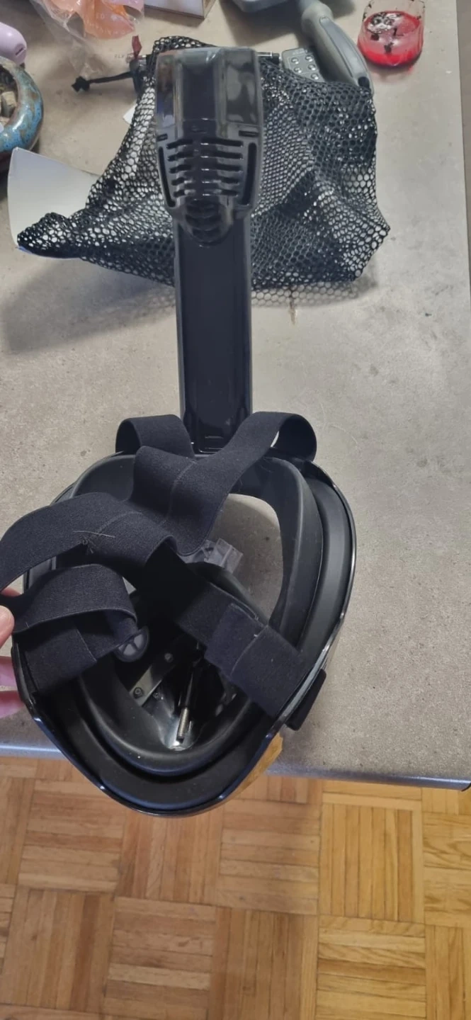 This full-face snorkeling mask offers a revolutionary dry breathing experience with 180° vision. It's anti-fog and comes with a mesh bag for easy carrying. The mask is black and size XL.