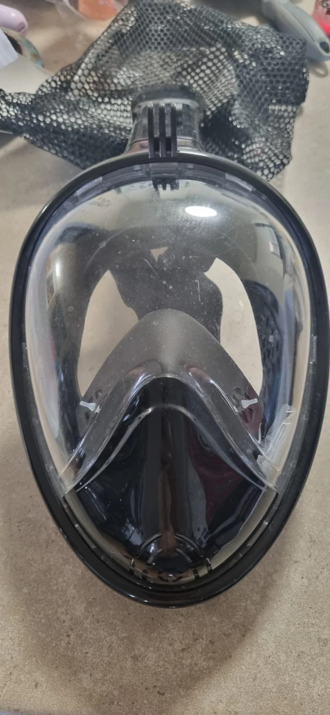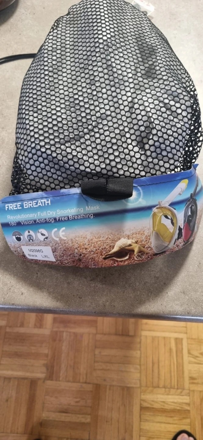 This full-face snorkeling mask offers a revolutionary dry breathing experience with 180° vision. It's anti-fog and comes with a mesh bag for easy carrying. The mask is black and size XL.