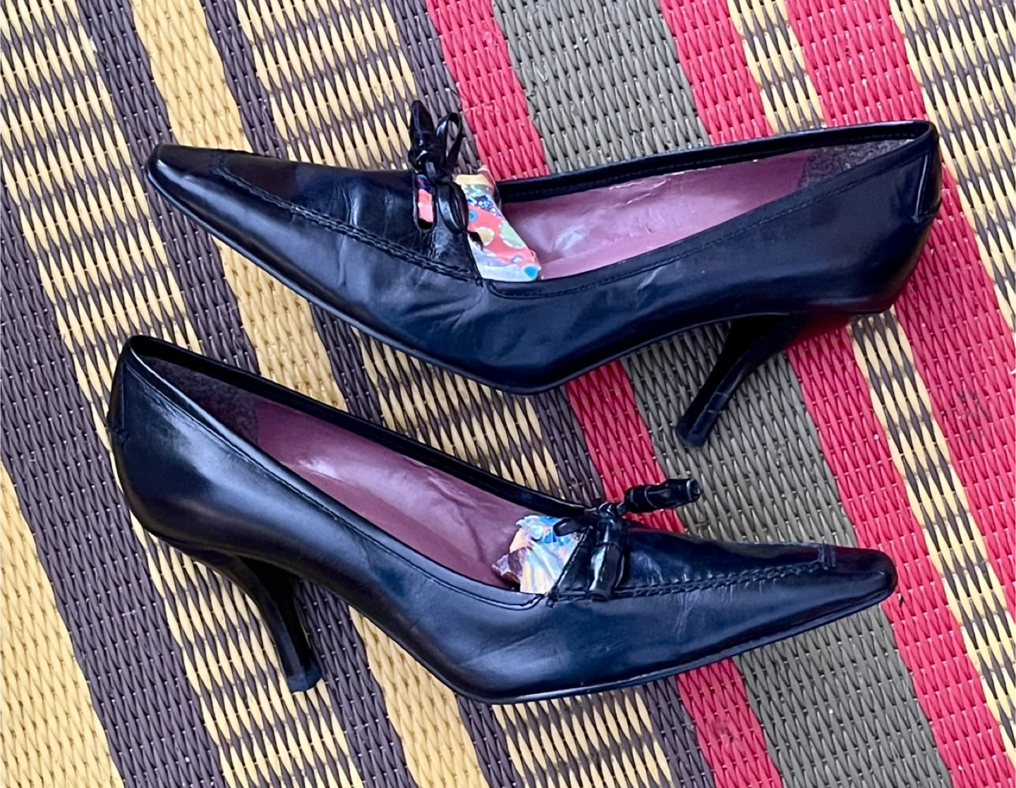 Black leather pointy-toe high heel pumps from Bandolino. Features a small decorative bow on the vamp. Size 7 Medium. Heel height is approx 3 inches. Excellent condition