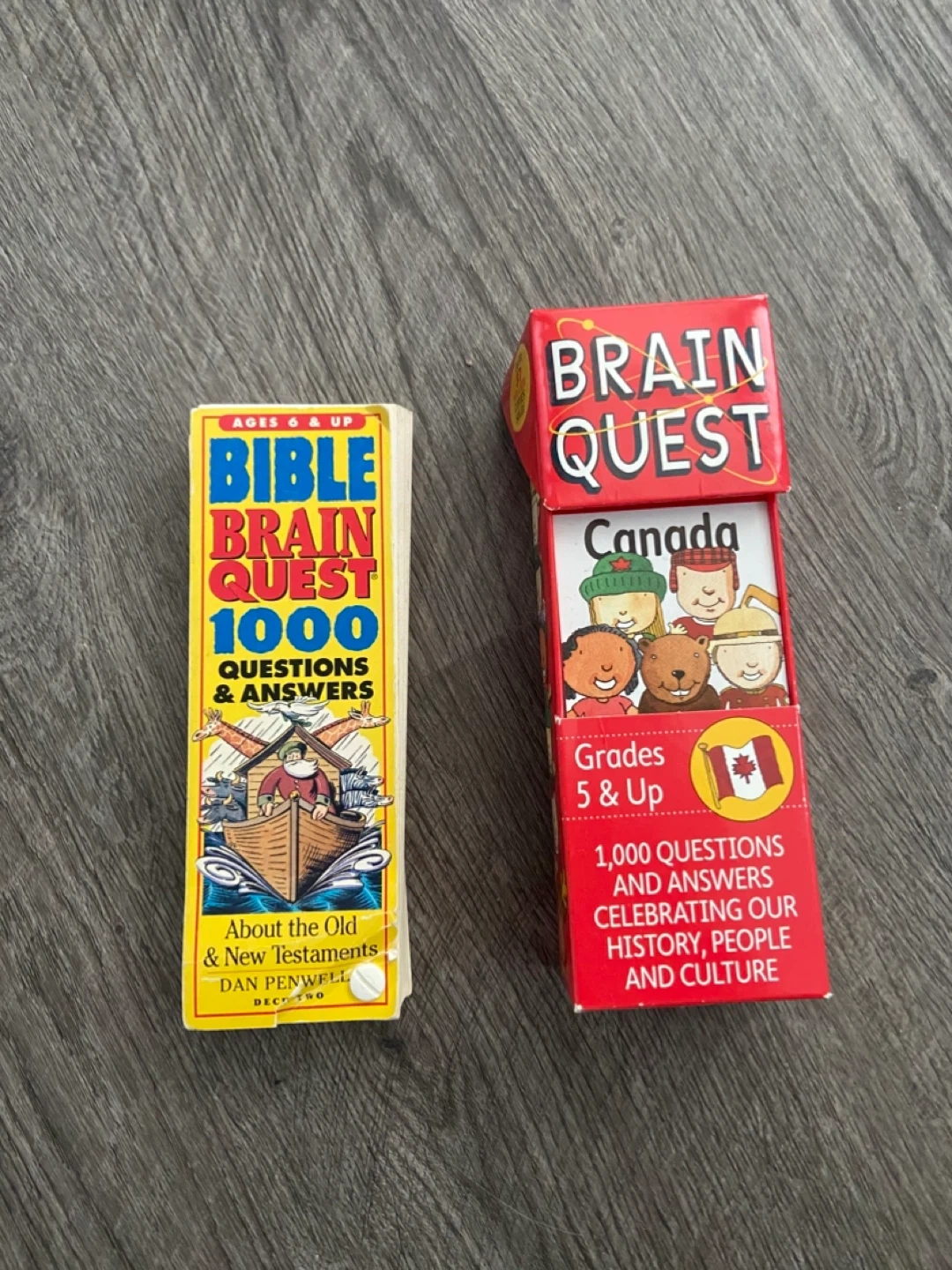 Two Brain Quest card games are included. One is 'Bible Brain Quest 1000 Questions & Answers About the Old & New Testaments,' suitable for ages 6 & up. The other is 'Brain Quest Canada Grades 5 & Up,' featuring 1,000 questions celebrating Canadian history, people, and culture. These card games are designed to test knowledge and provide fun learning experiences.