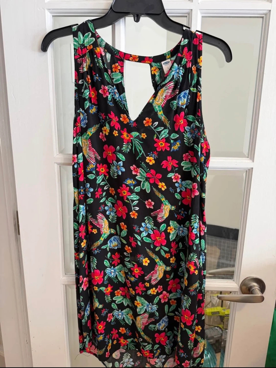 This is a sleeveless V-neck dress from Old Navy. It features a keyhole cutout at the back and a flowy silhouette. Available in multiple prints and colours.