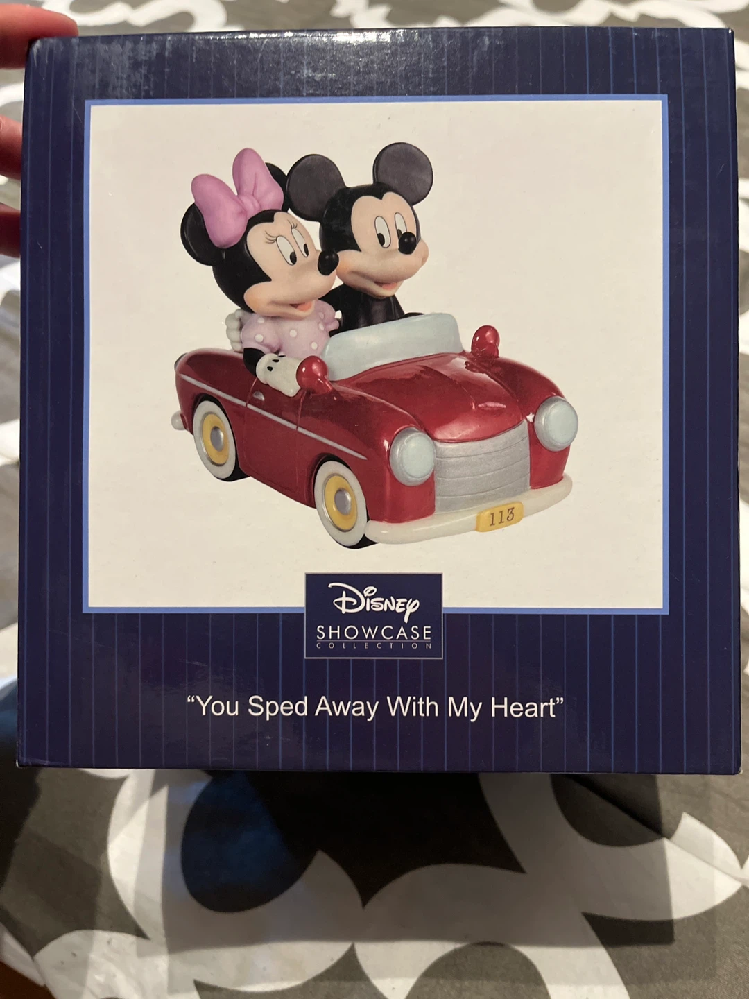 Selling a Disney Showcase Collection figurine by Precious Moments. It's a porcelain figurine featuring Mickey and Minnie Mouse in a car with the phrase 'You Sped Away With My Heart'. The box is included!