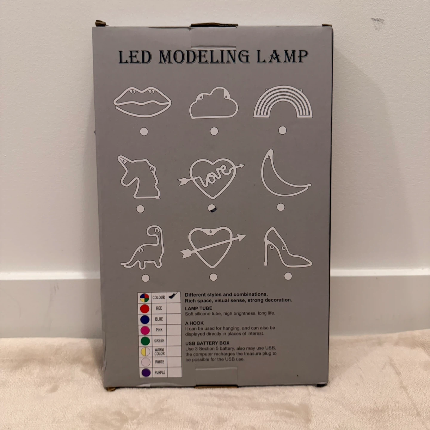 This LED modeling lamp features a love heart with an arrow design. It's USB powered or can use 3 AAA batteries (not included). The soft silicone tube provides a bright, long-lasting light.