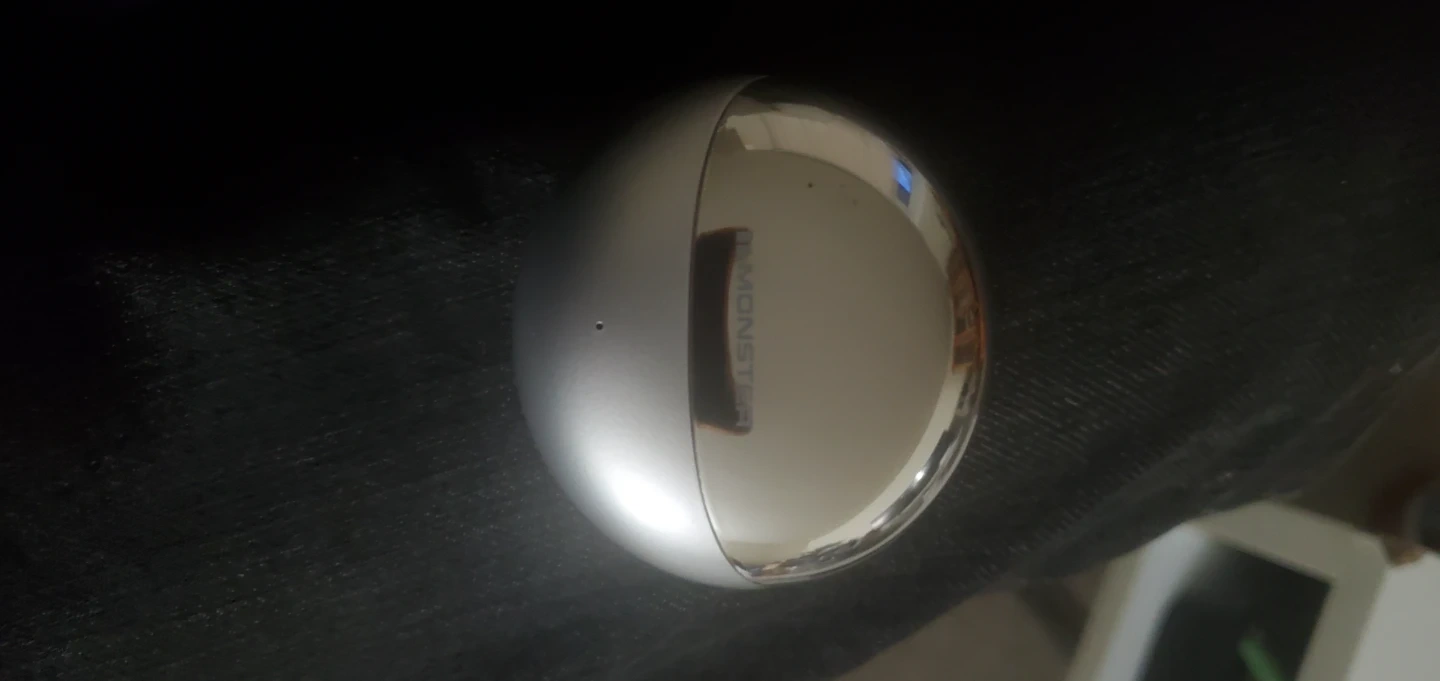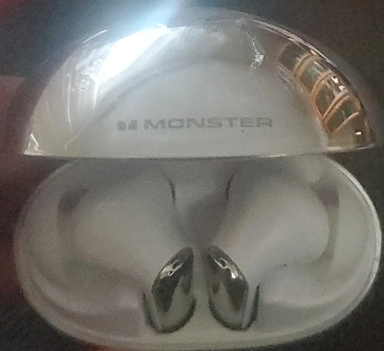 These are white Monster wireless earbuds. They come with a charging case. The earbuds have a sleek design with silver accents.