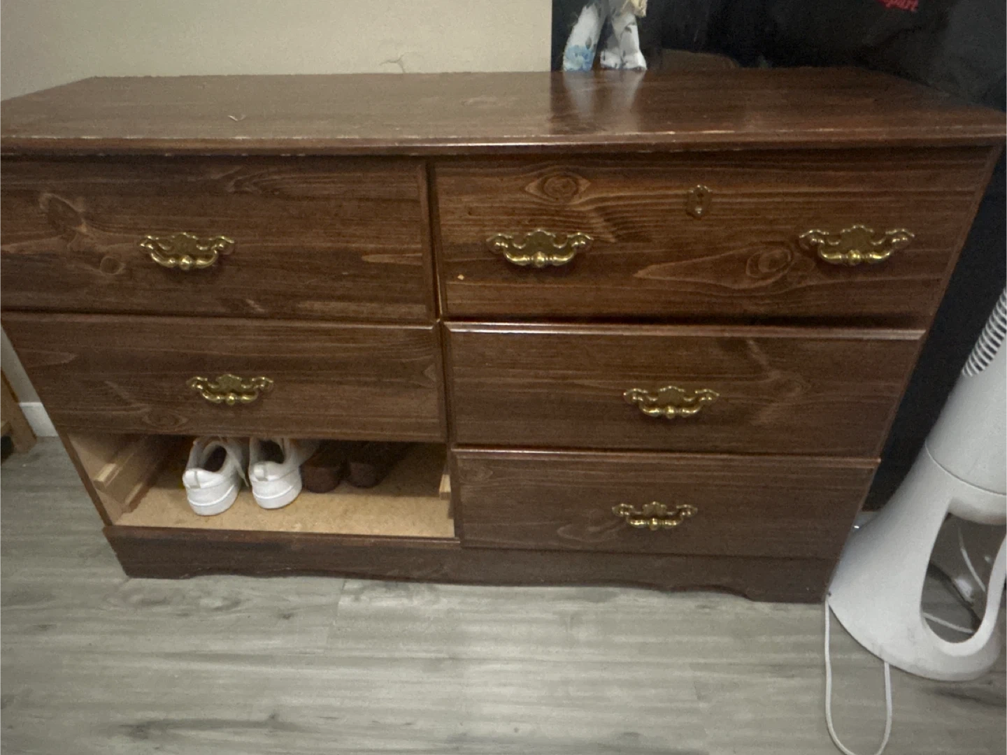 Brown wooden dresser with five drawers and brass-tone hardware. This dresser offers ample storage space. Affordable for everyone