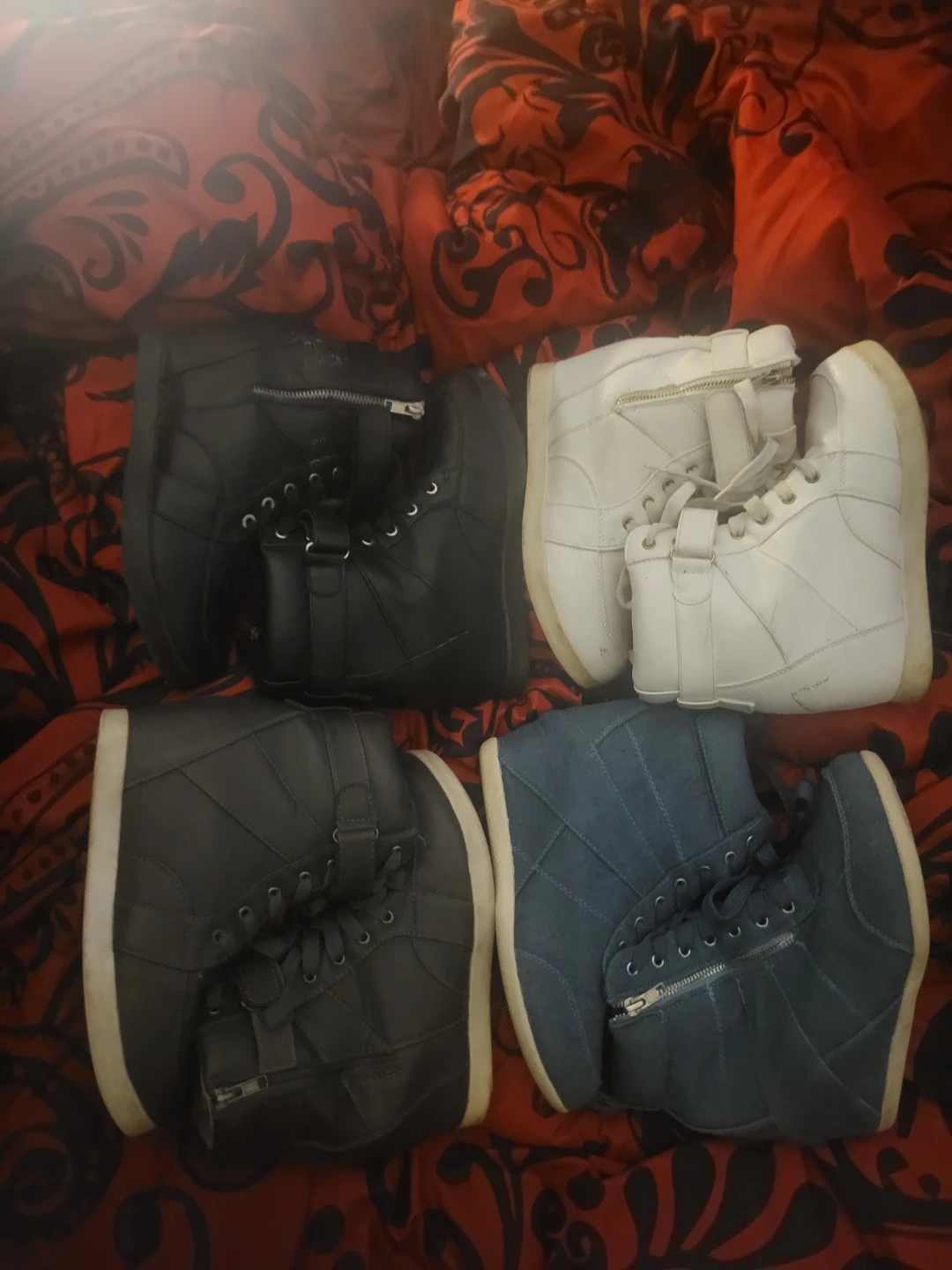 Four pairs of stylish wedge sneakers. Includes two black, one white, and one denim blue pair. These high-top sneakers feature laces and side zippers. Perfect for adding some height and flair to your casual outfits!