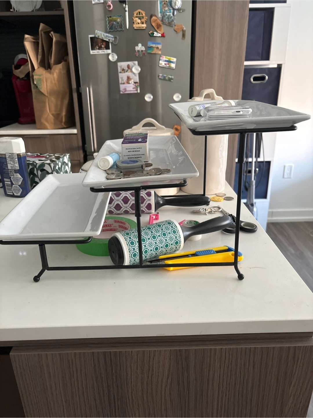 This is a white 3-tier serving tray with a black metal stand. It's perfect for displaying snacks, desserts, or small items. The trays are rectangular and have a clean, modern look. The trays are ceramic.