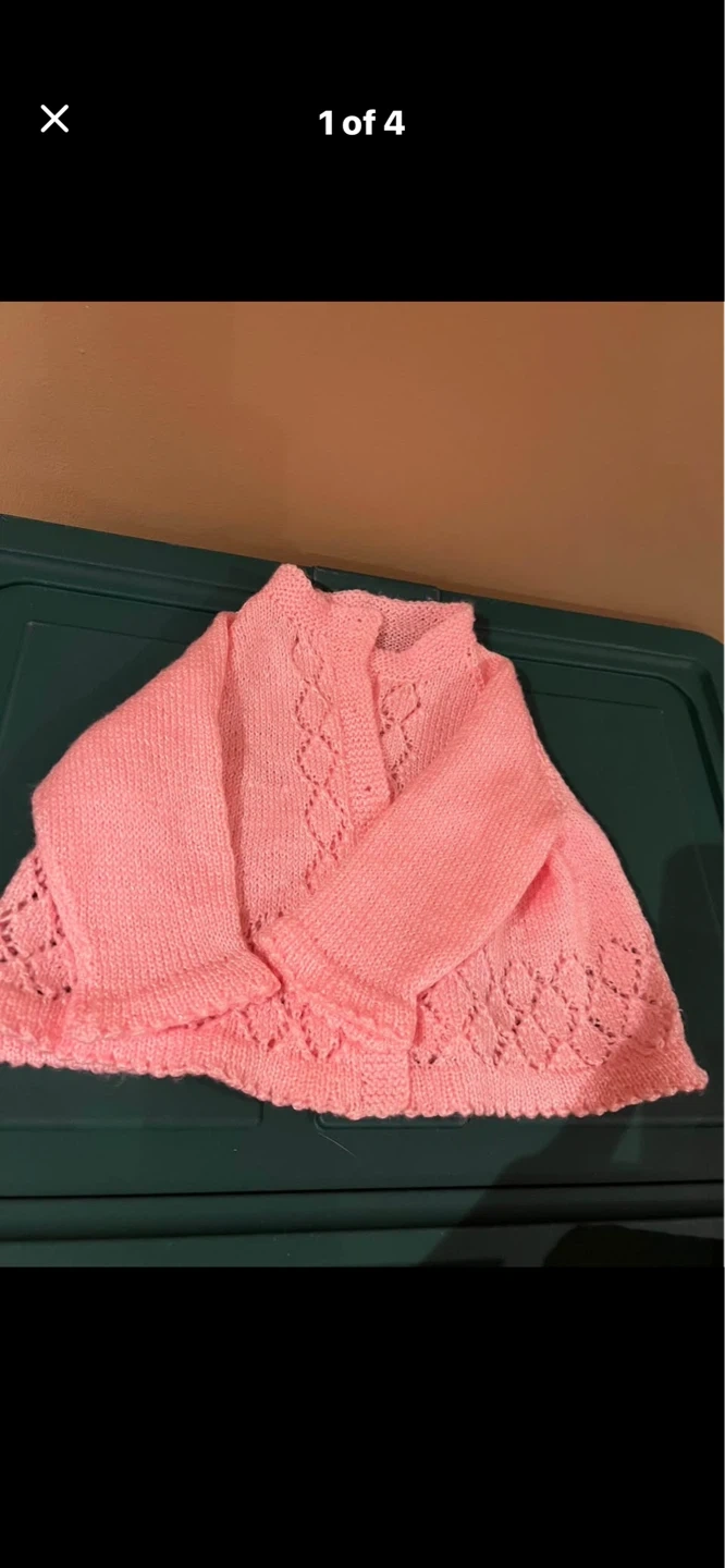 This is a lovely pink knitted baby cardigan. It features a delicate lace pattern along the hem and yoke. It's perfect for keeping your little one warm and stylish!