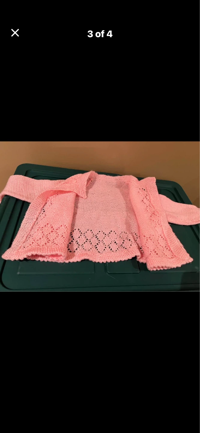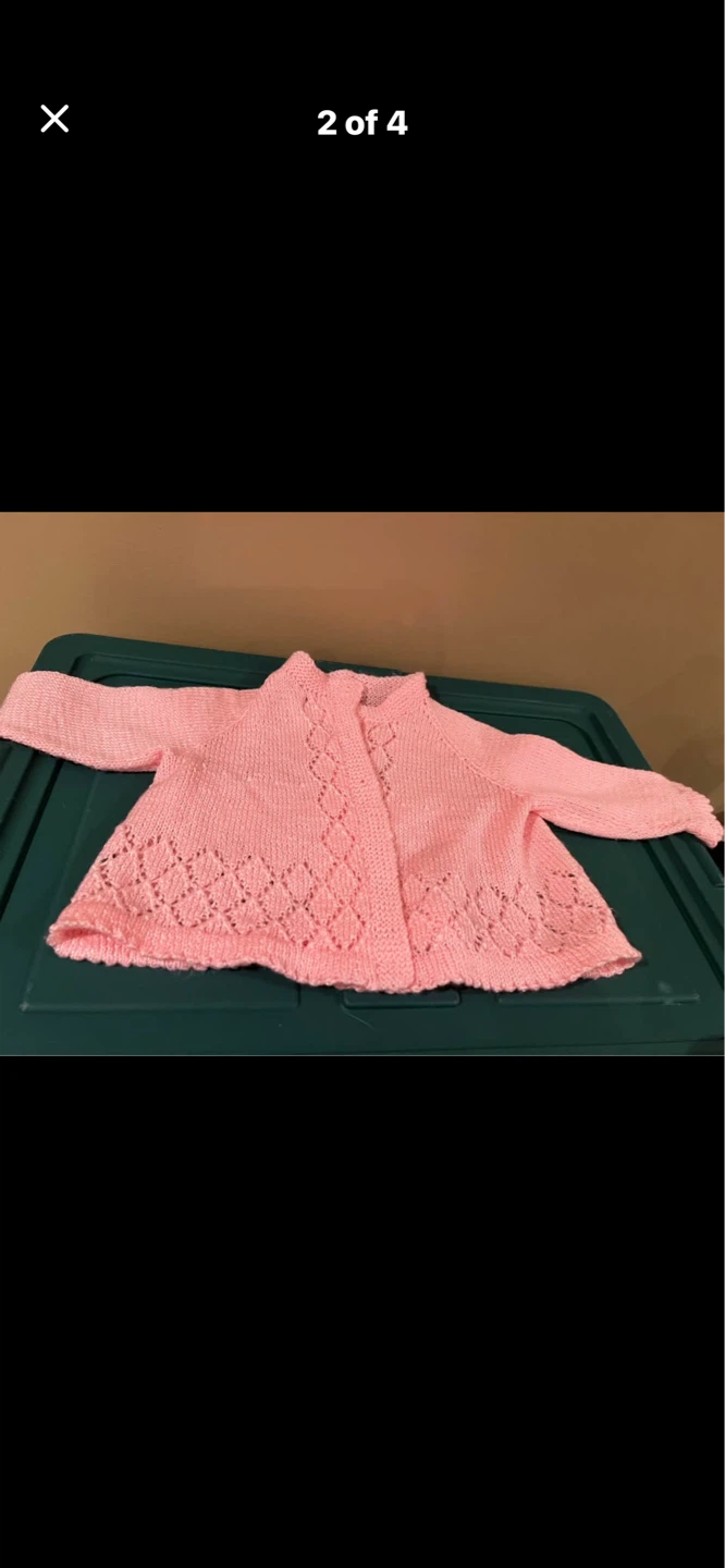This is a lovely pink knitted baby cardigan. It features a delicate lace pattern along the hem and yoke. It's perfect for keeping your little one warm and stylish!