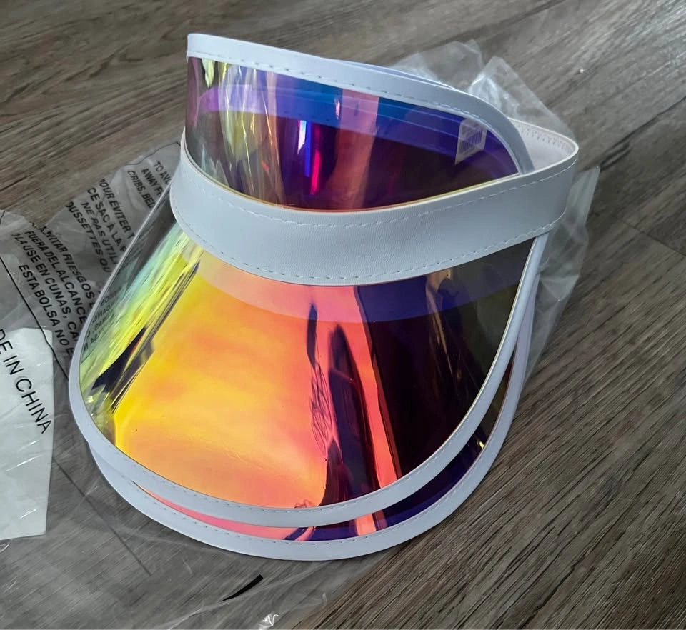 Colorful iridescent sun visors. 10x Clear visors with an iridescent effect, 5 x pink iridescent (shows more orange in photos than in person). Still in original packaging, never used. Bought these for an event and never got around to using them. Take all for $40 or $15 for a pack of 5. Pickup SW / Terwillegar / meet on campus most weekdays. Check my other listings, bundle for deals!
