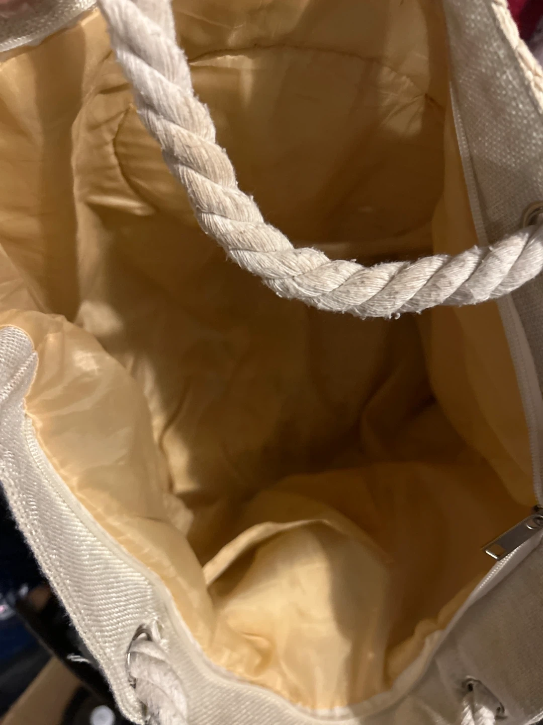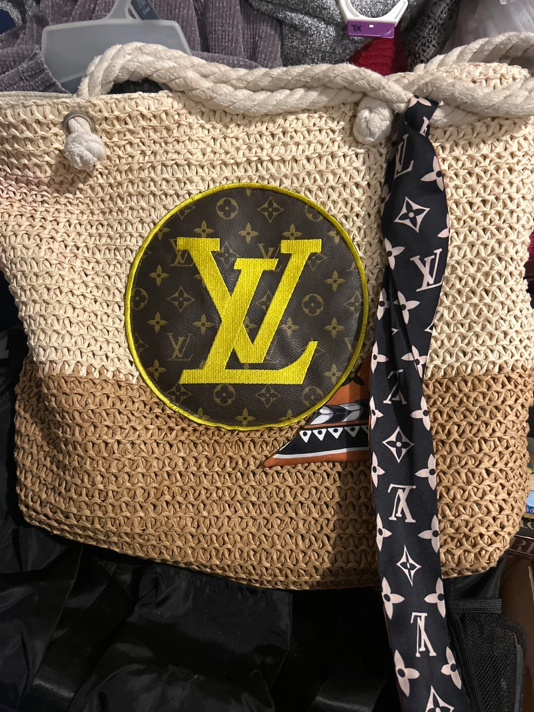 Woven straw tote bag with a removable decorative scarf. Features a large LV-inspired applique. Interior is lined with a zippered pocket.