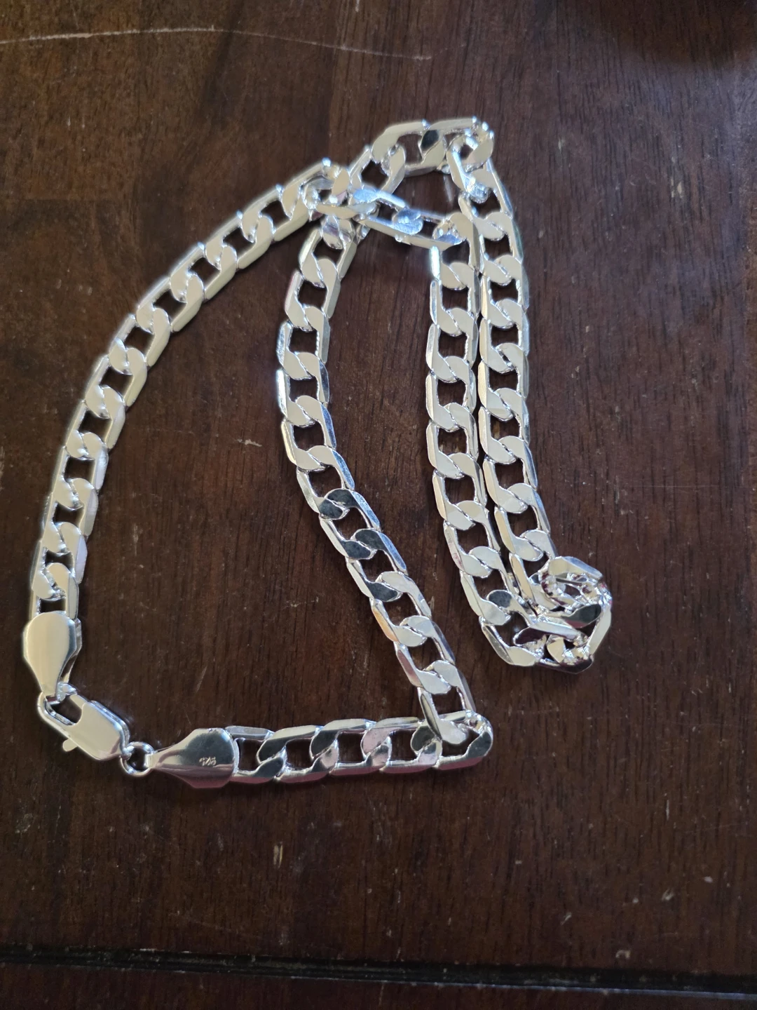 A classic sterling silver curb chain necklace. It has a polished finish and a secure clasp. This necklace is a versatile accessory for everyday wear or special occasions.