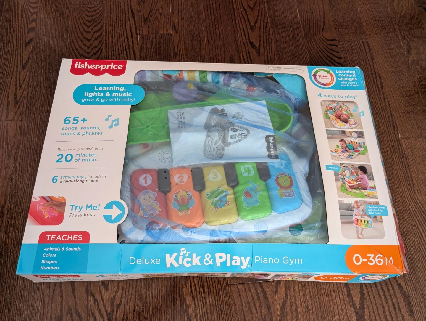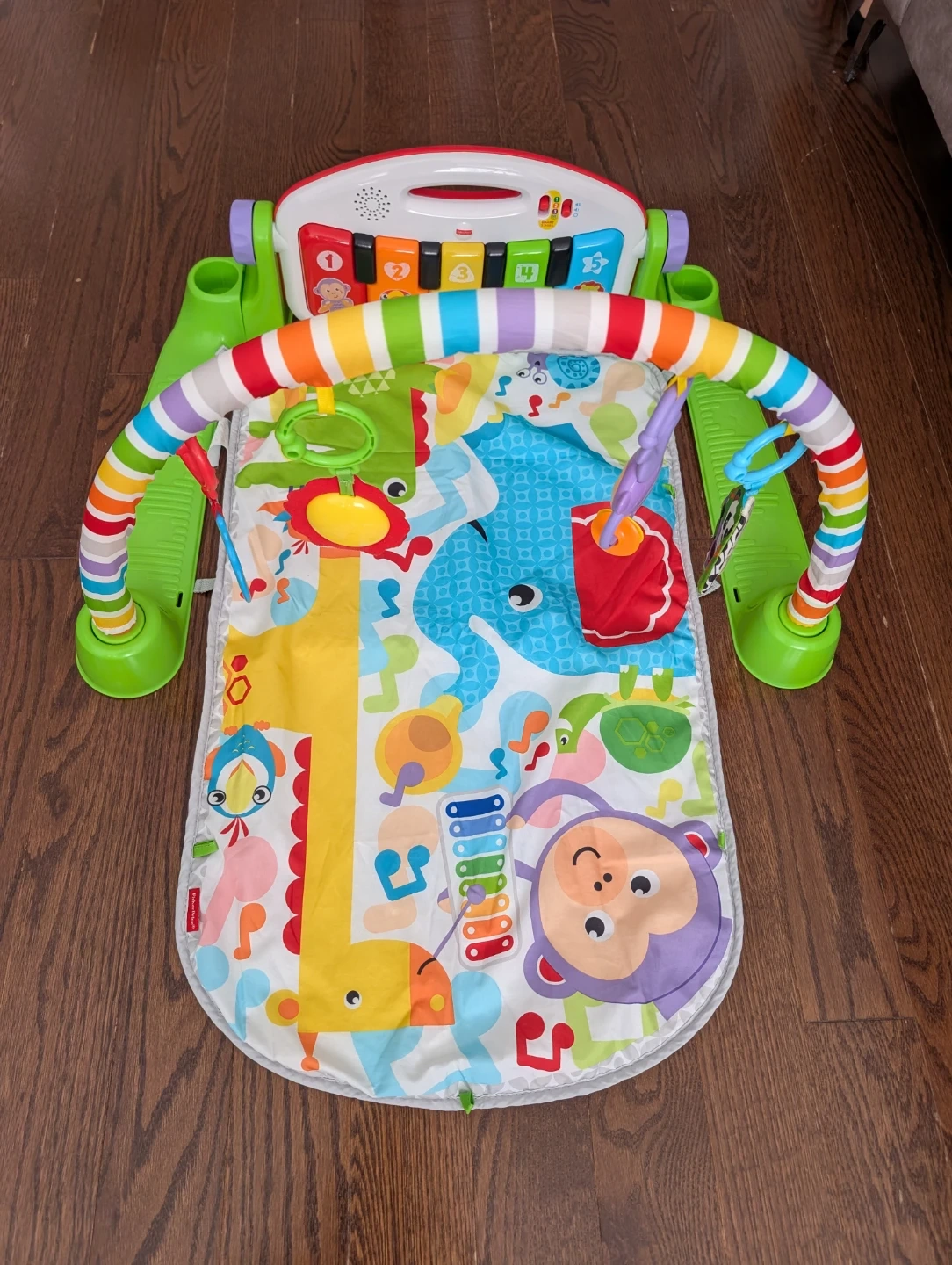 This Fisher-Price Deluxe Kick & Play Piano Gym features 4 ways to play and includes over 65 songs, sounds, tunes & phrases. It has activity toys, including a take-along piano. Learning content grows with baby, teaching animals, sounds, colours, shapes, and numbers. Working well, batteries are not included.