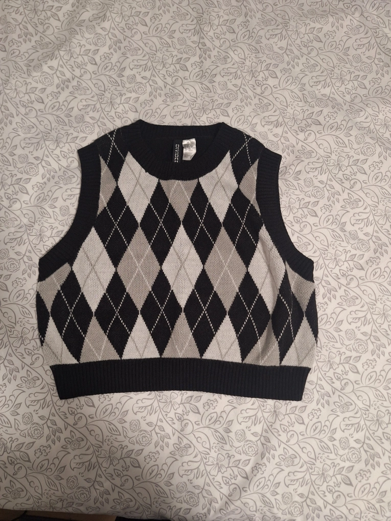 Selling a gently used H&M Divided sweater vest. It features a classic argyle pattern in black, grey, and white. Size is M.