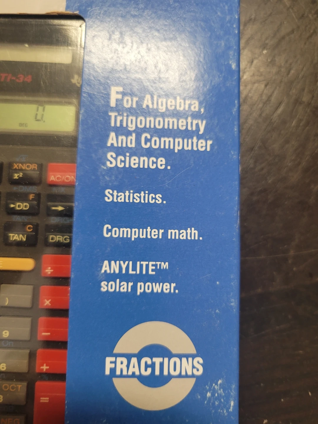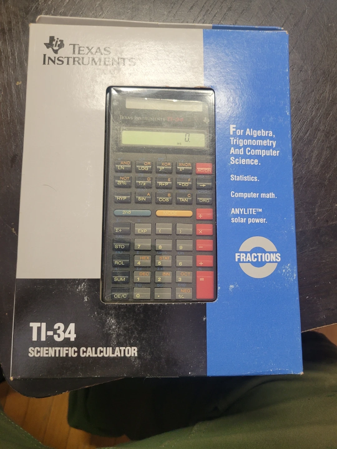 This is a New TI-34 Scientific Calculator is great for algebra, trigonometry, and computer science. It features ANYLITE solar power. Includes manual and quick reference card. Ideal for students needing a reliable calculator for advanced math.