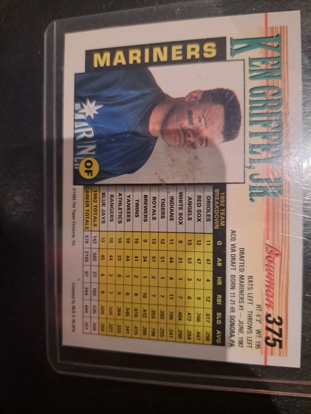 This is a 1992 Bowman baseball card featuring Ken Griffey Jr. The card displays his stats and career breakdown. It's a collectible item for baseball fans.
