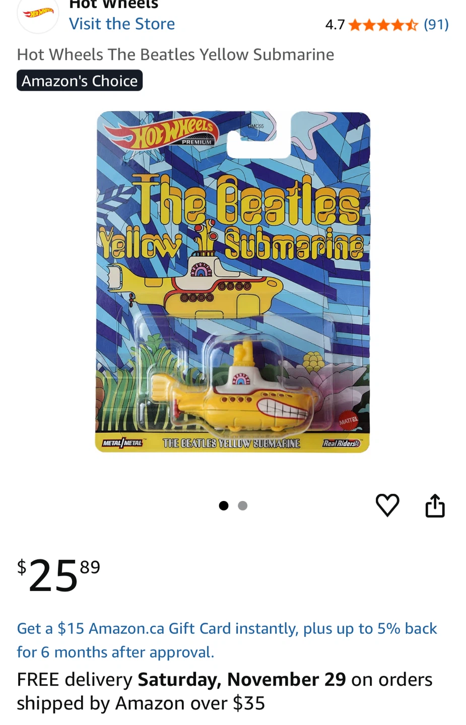 Selling a Hot Wheels Premium Pop Culture The Beatles Yellow Submarine die-cast car.