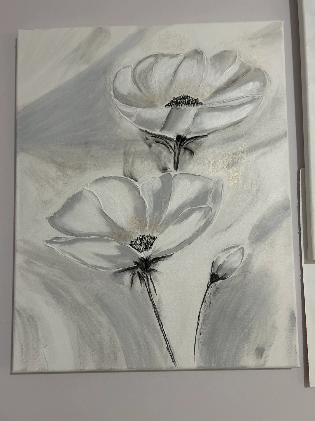 Canvas art with a floral design. Features two open blooms and one bud. Painted with shades of white and gray. Such artwork is perfect for creating a peaceful atmosphere.