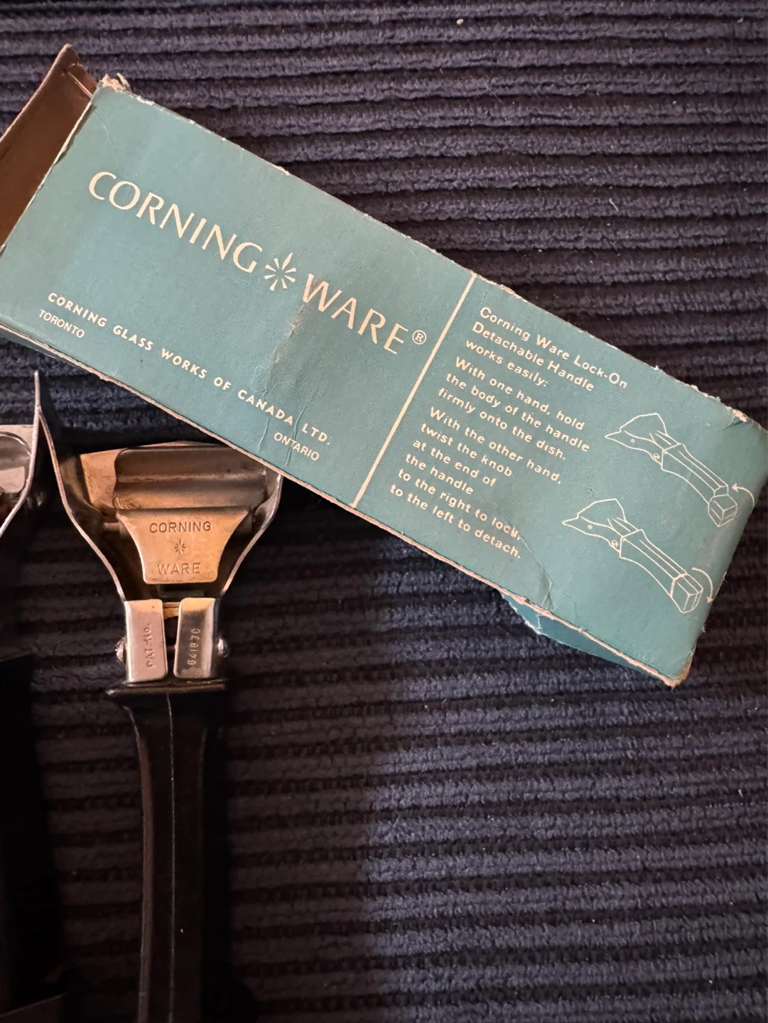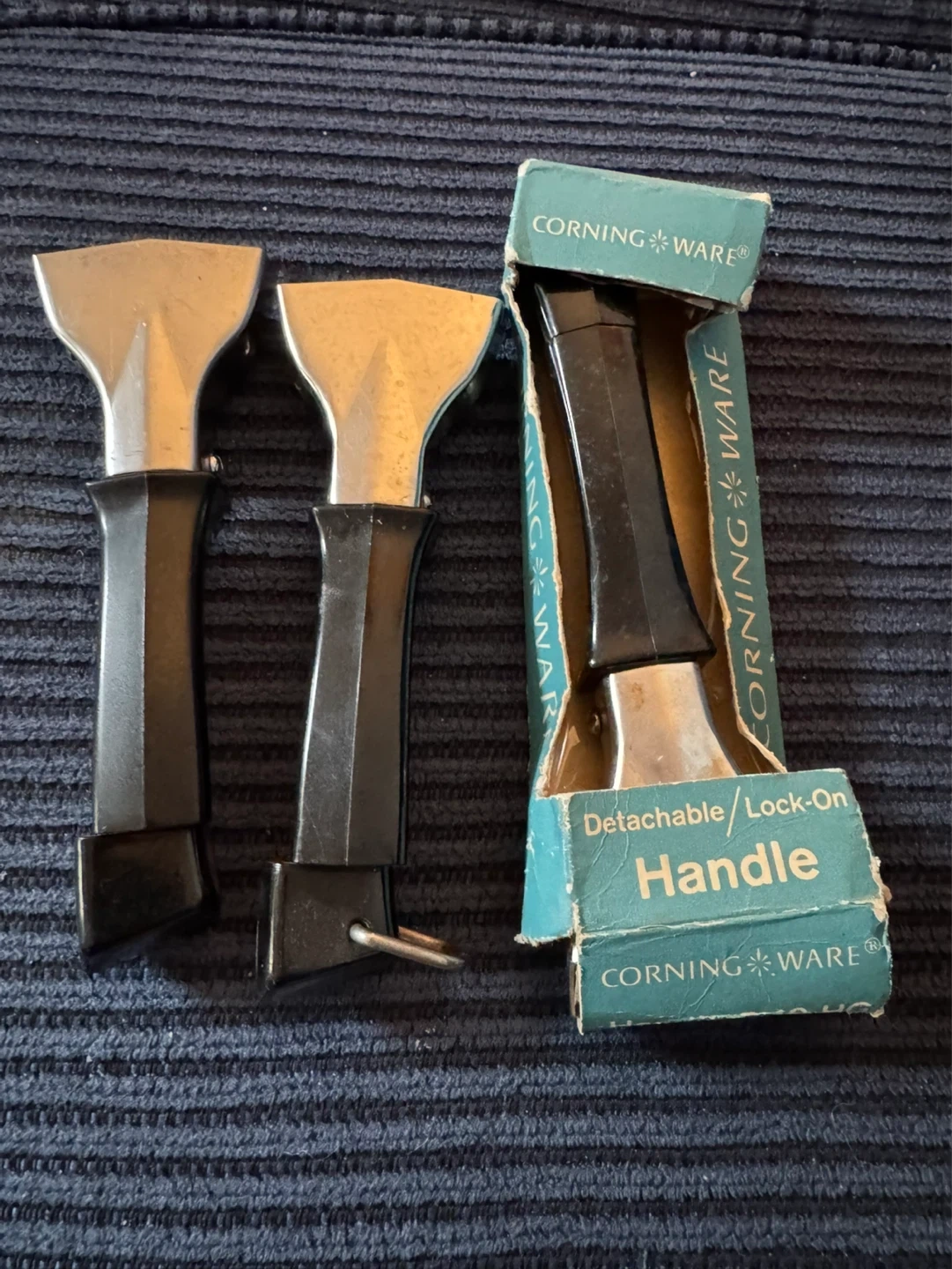 Set of THREE vintage Corning Ware detachable lock-on handles.