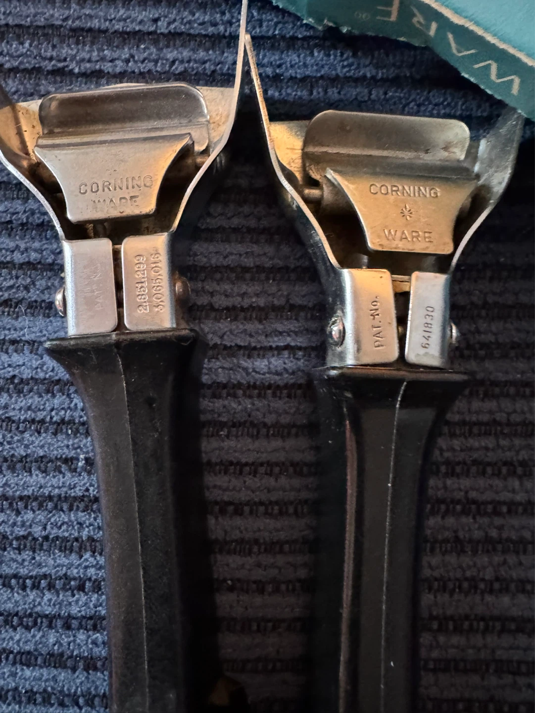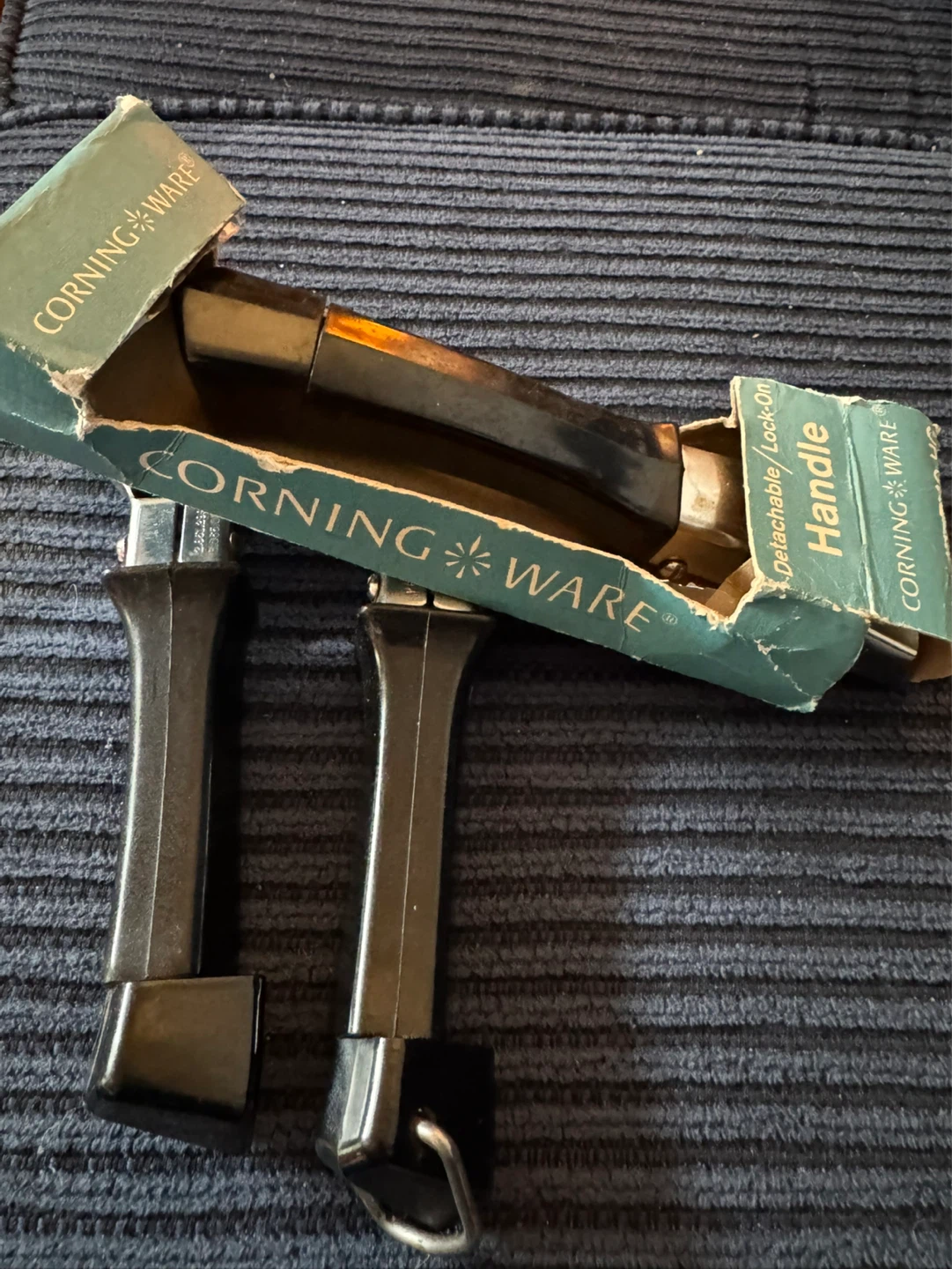 Set of THREE vintage Corning Ware detachable lock-on handles.