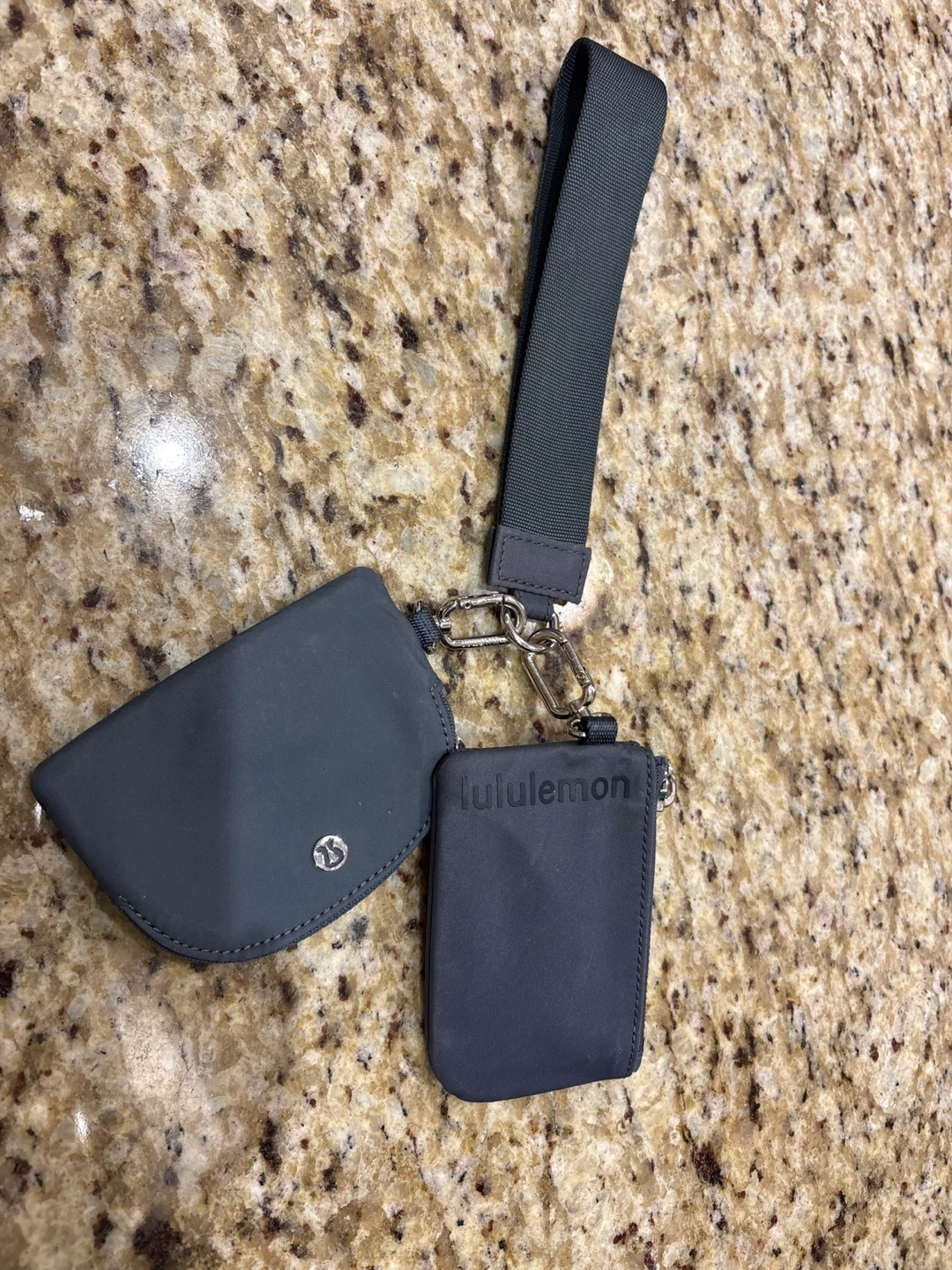 Lululemon grey multi pouch set. Includes a larger curved pouch and a smaller zippered pouch, attached by a strap and carabiner. These pouches are made of durable fabric.