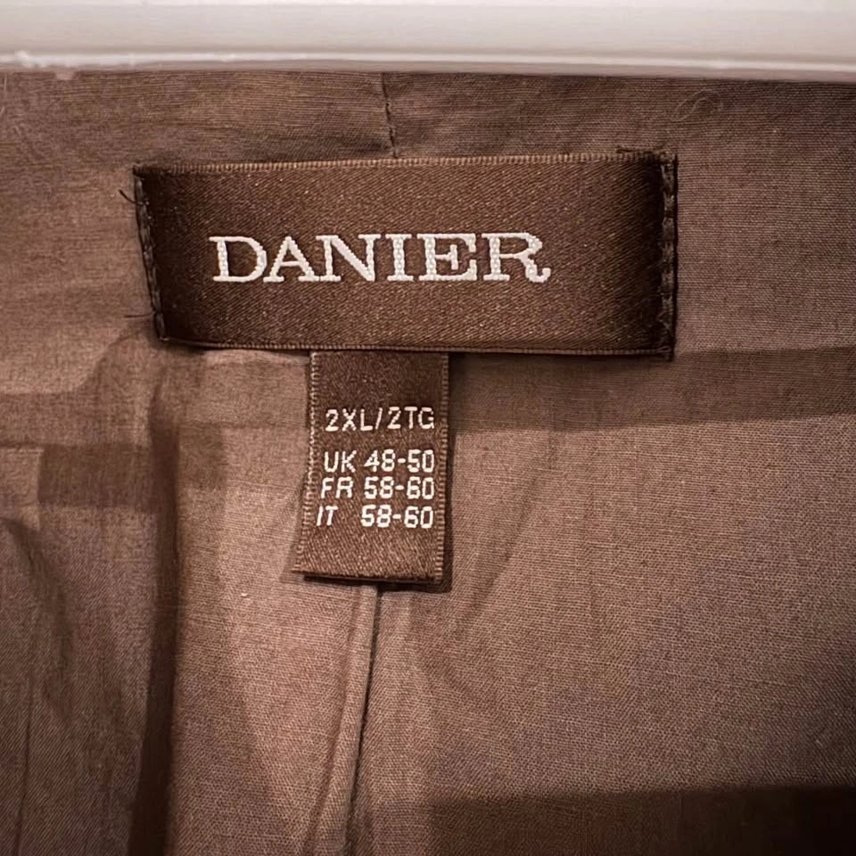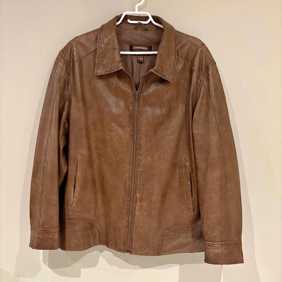 Classic Danier brown leather jacket. Ideal for layering. Sleek and timeless design. Minor scrapes on leather, otherwise great condition, no tears. Lots of pockets on the inside. Men's 2XL. Pit to pit 26".